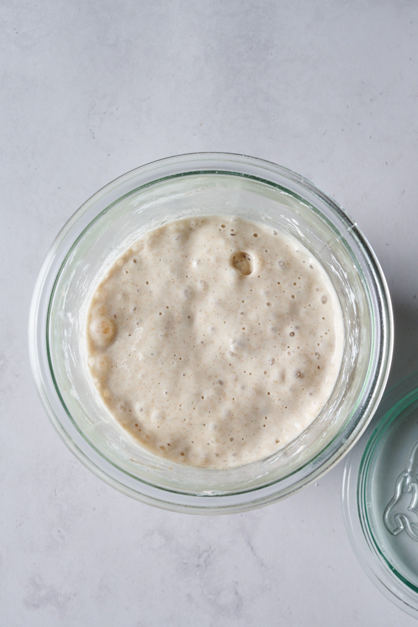 Here’s how my starter looked coming out of the Sourdough Home on Day 6. After placing my starter inside, it continued to ferment and rise even in the cold temperature, and near the end of Day 5 and on Day 6, it just sort of stopped and hung out there at the peak height. There were plenty of bubbles on top and at the sides, it was well-aerated, and it may have even fallen just a bit (which is okay). The aroma was mild, but there were hints of acetone, which is an indicator that it’s getting close to needing a feeding.