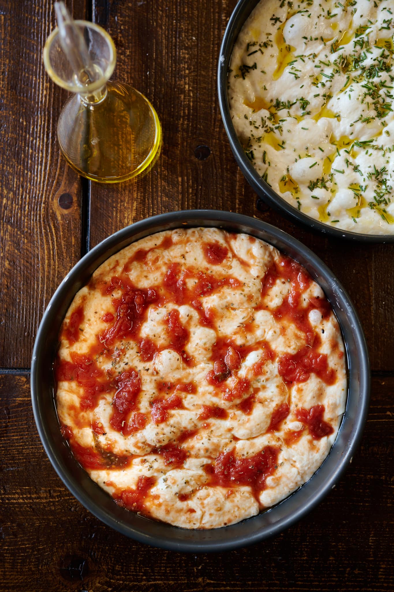 First, liberally grease your focaccia pans (or single pan, if using a rectangular pan) with olive oil. Do not be shy; add plenty of olive oil to the bottom and use a brush to spread it around. Part of the charm with focaccia Pugliese is the flavor and texture benefits that come from using ample amounts of olive oil both in the bottom of the pan and on top before baking.