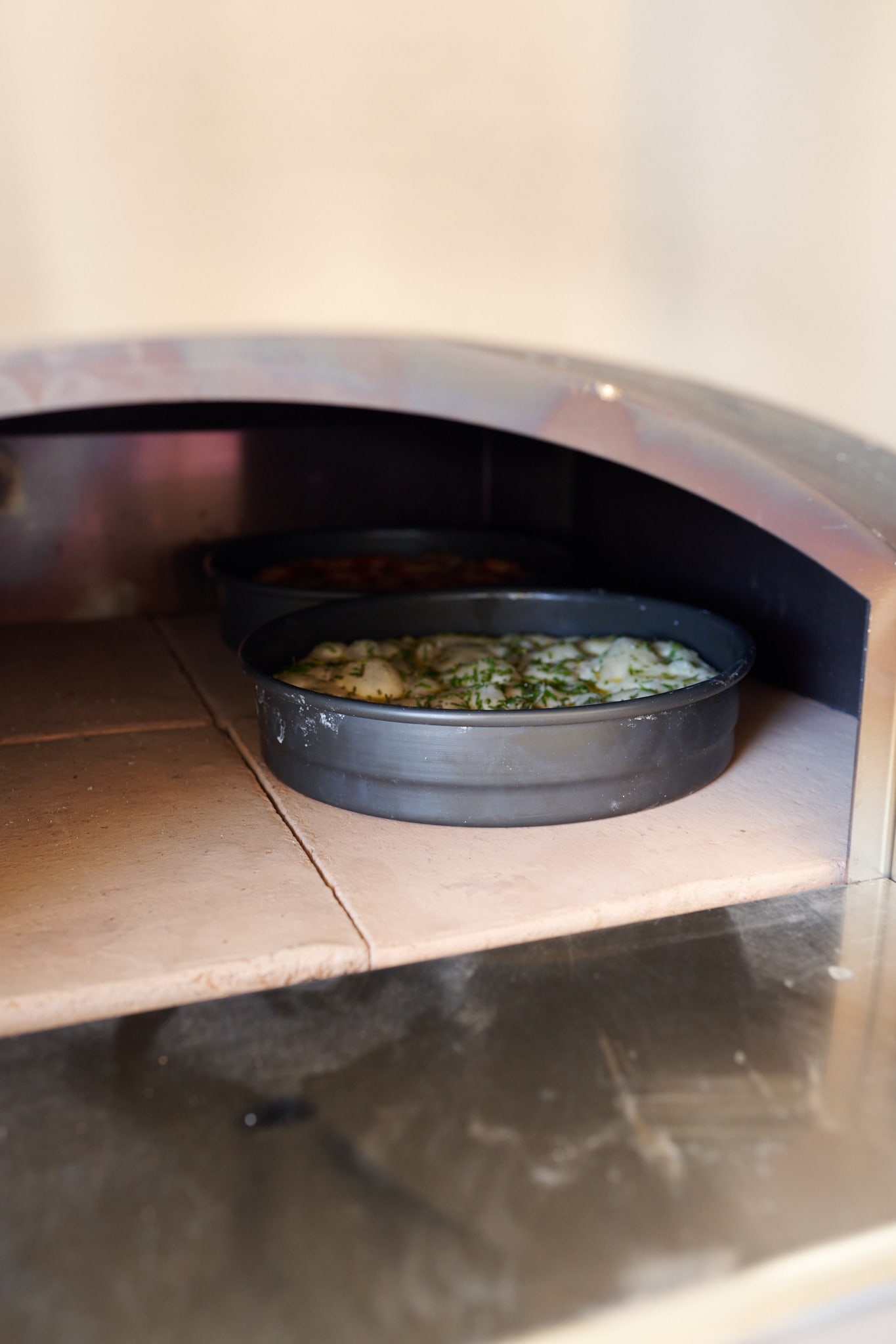 Preheat your wood-fired oven until the floor temperature reaches a little over 400°F (200°C). Then, let the fire die down and wait until the ambient temperature is also around 400°F (200°C). To do this, I keep the oven door closed and partially close the damper to retain heat. Use the oven door and damper to speed up or slow down the cooling of the floor to coincide with when your focaccia dough is ready to be baked.