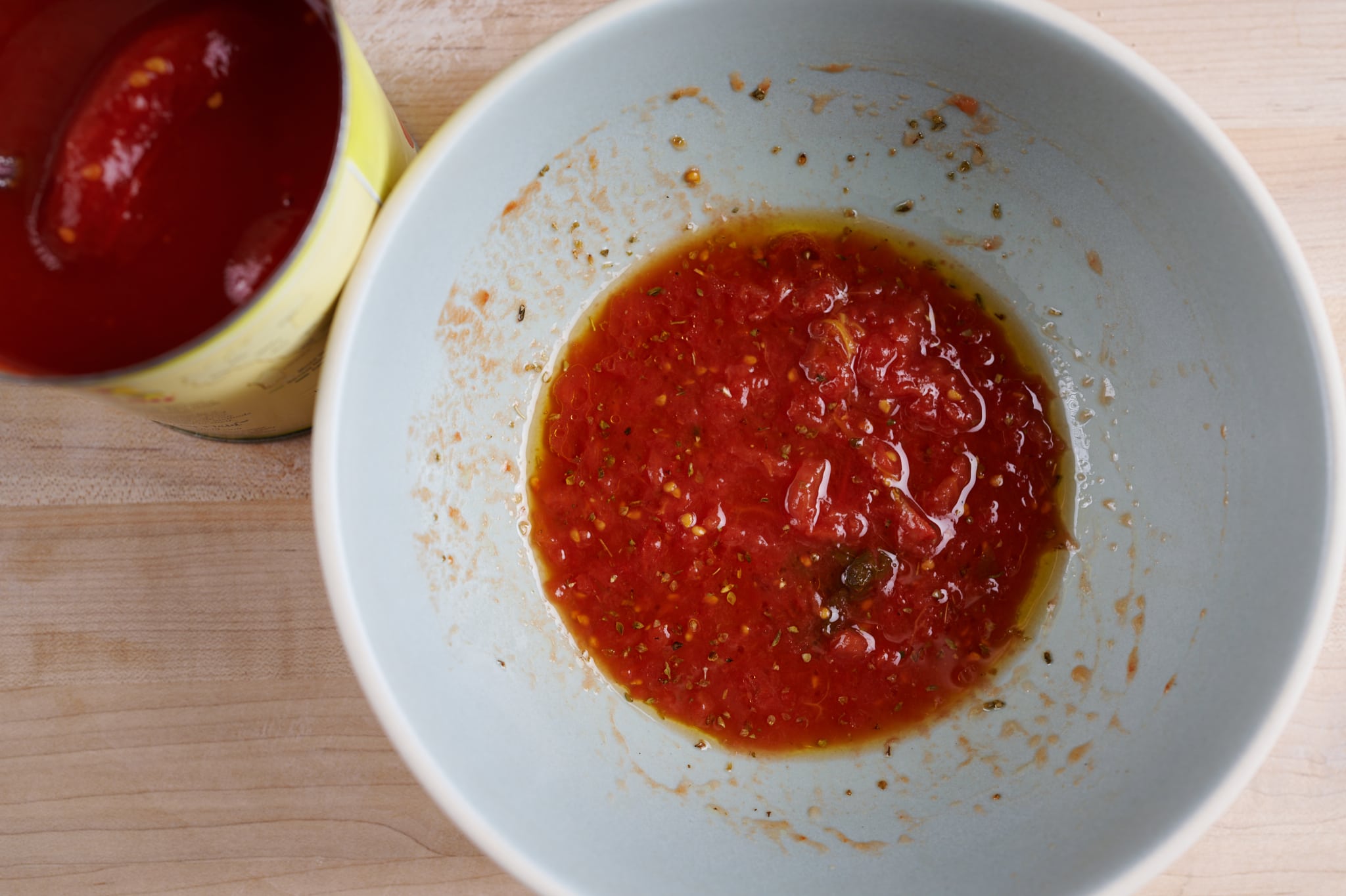 To make the tomato topping, put 2 whole peeled tomatoes in a small bowl and crush them with your hands (the Italian way) or the back of a spoon. Add ½ teaspoon dried oregano, ½ teaspoon fine sea salt, and about 2 tablespoons extra-virgin olive oil. Stir until well combined.