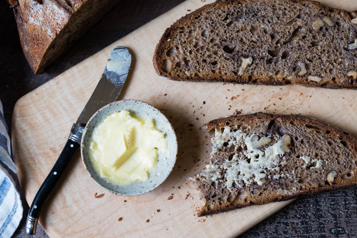 While the cost of walnuts can make one hesitant to make this bread it is worth it, trust me. The rich flavor of the toasted walnuts and roasted walnut oil makes this bread a luxurious shift from weeks of white bread. Bread that can break any rut, make you buy more cultured butter at the store than you thought possible, and have you lusting after just one more slice for lunch. Shoot, this is lunch.