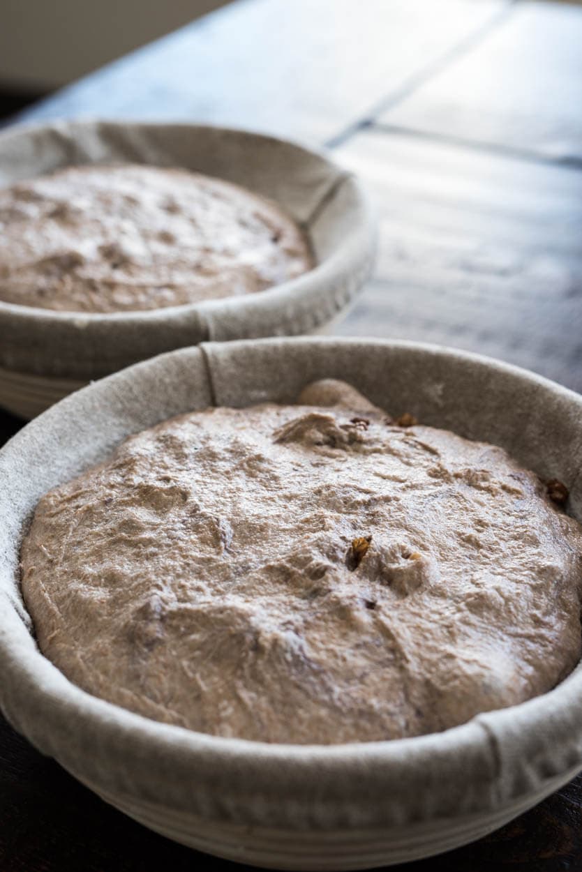 After the third set of stretch and folds, performed gently as the dough now has a bunch of walnuts within, let rest for the remainder of bulk. The dough will not rise an incredible amount, but it should be slightly jiggly and some bubbles on top and sides.