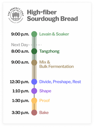 This high-fiber sourdough bread is made all in a single day, except for the overnight levain and seed soaker. The night before you want to bake these loaves, prepare the levain when your sourdough starter is ripe, and make the seed and oat soaker simultaneously. The next day, mix the dough when the levain is ripe, ferment it throughout the day, then bake it in the later afternoon or evening.