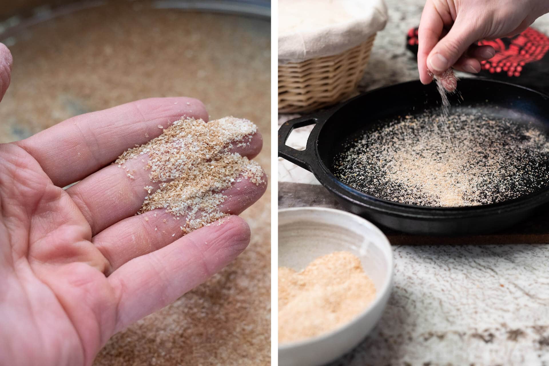 The image above shows the large germ/bran particles I’ve sifted out with my sifting screen. The fine, high-extraction flour falls through my screen into a bowl that I can add when mixing my bread dough. Then, I collect these larger bits to either add to the dough as porridge or use to coat the bottom as insulation.
