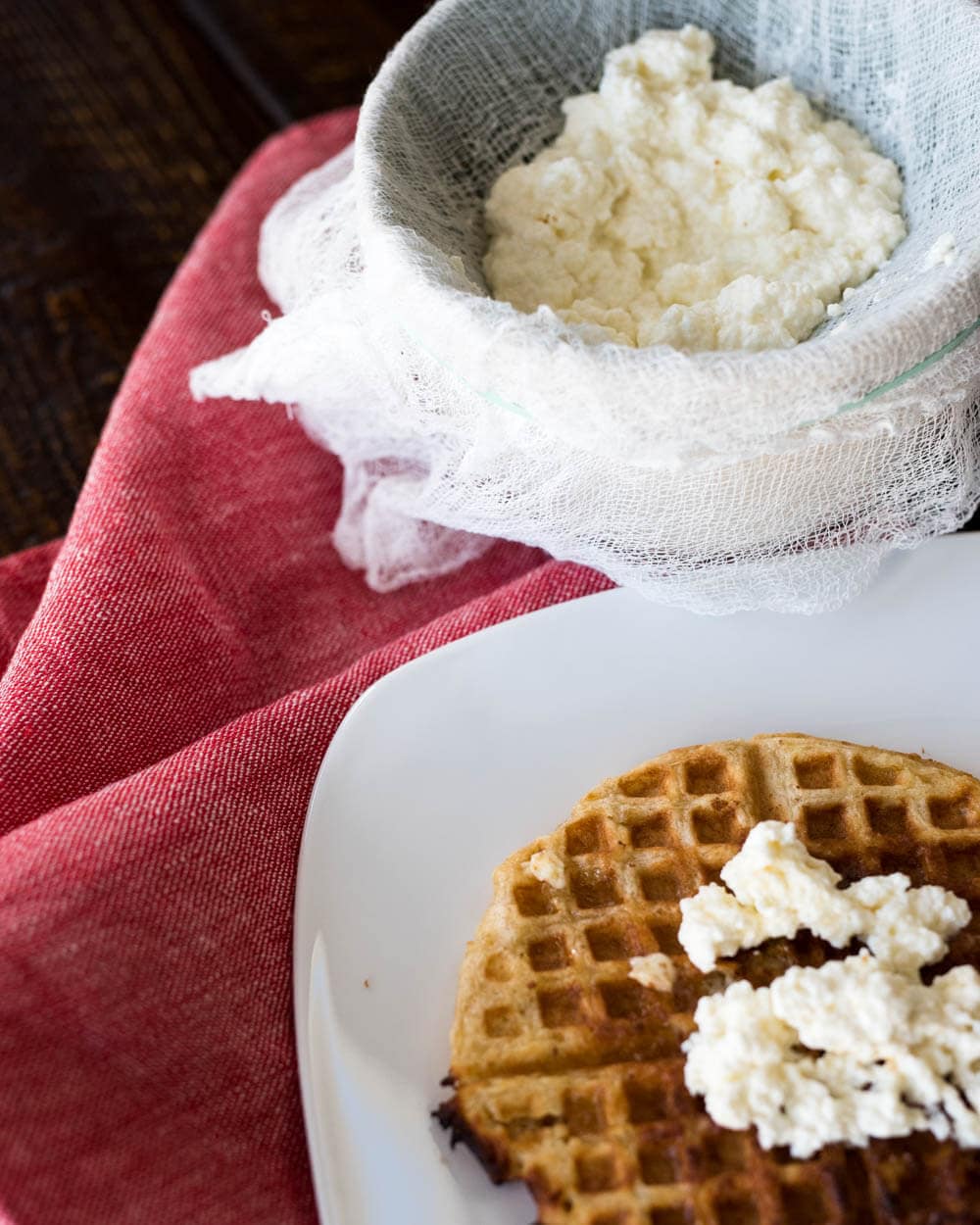 This ricotta will last about four days in the fridge. We ate the entire batch warm, right from the stove, on top of my freshly made sourdough waffles. We placed a dollop or two of the ricotta on top of the waffles after a good slathering of butter and then topped it all off with some light maple syrup. The warm cheese went exceptionally well with the slightly-sour crisp waffles, and I would say perhaps a few blueberries would have taken it even further.