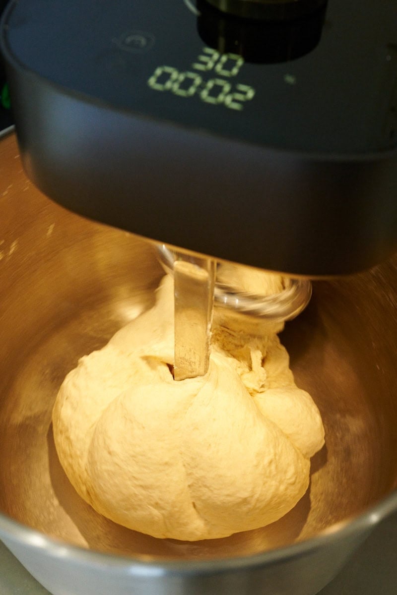 The way the dough rotates around the breaker bar when mixing creates this shape. Below, you can see it nearing the end of the first phase of mixing. The dough is starting to pumpkin in the mixing bowl, but it’s still shaggy and not quite strong enough (it needs about three more minutes of mixing).