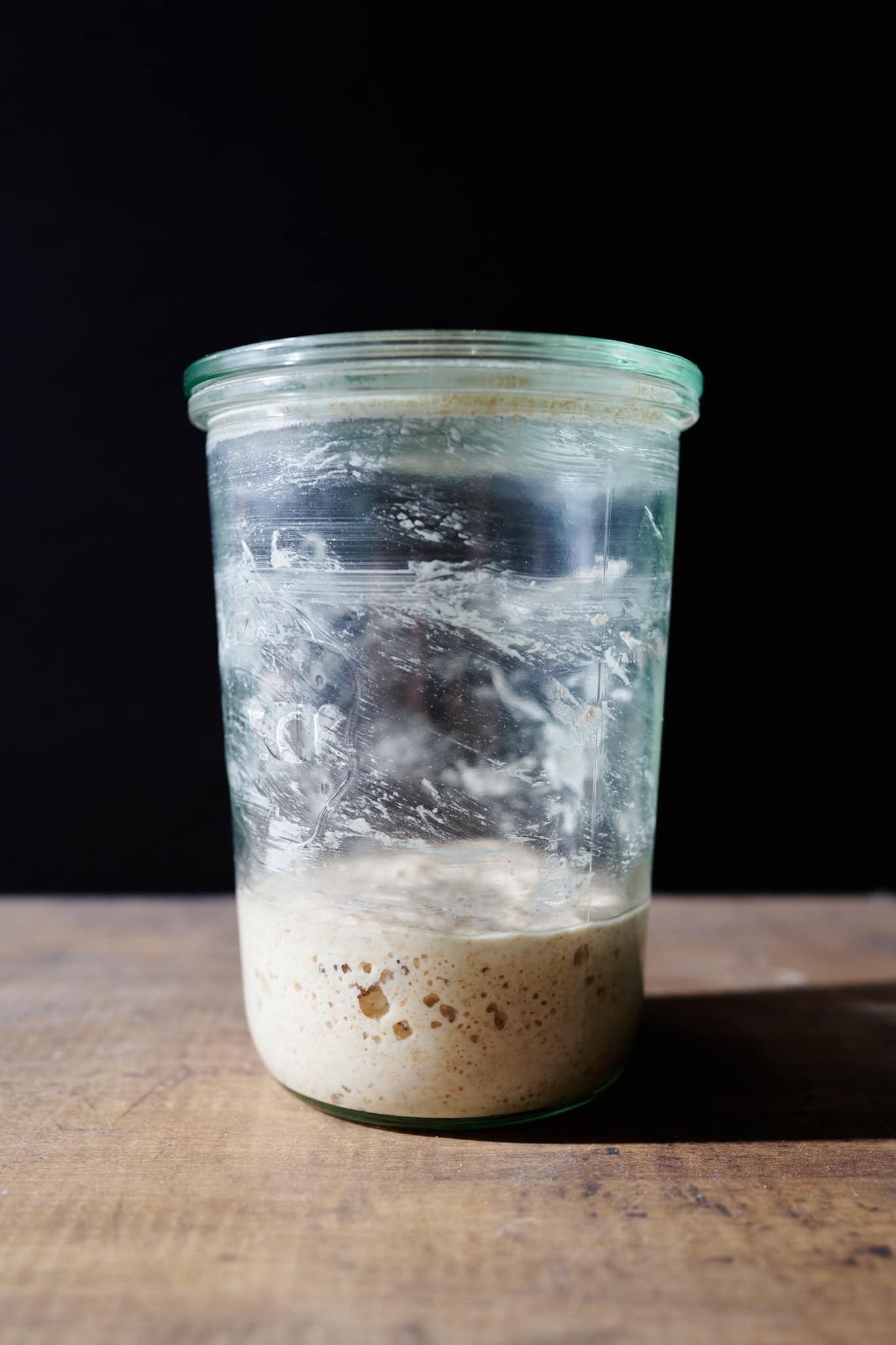 I have found that a stiffer starter, or one with less water to total flour, can handle the cold temperatures of the refrigerator a little better than those with 100% hydration. Reducing the water can help ensure it doesn’t over-ferment while in the refrigerator, and like with a stiff levain, it has proven to be more resilient for me. Less water in the mixture ultimately prevents excessive acidification and breakdown.