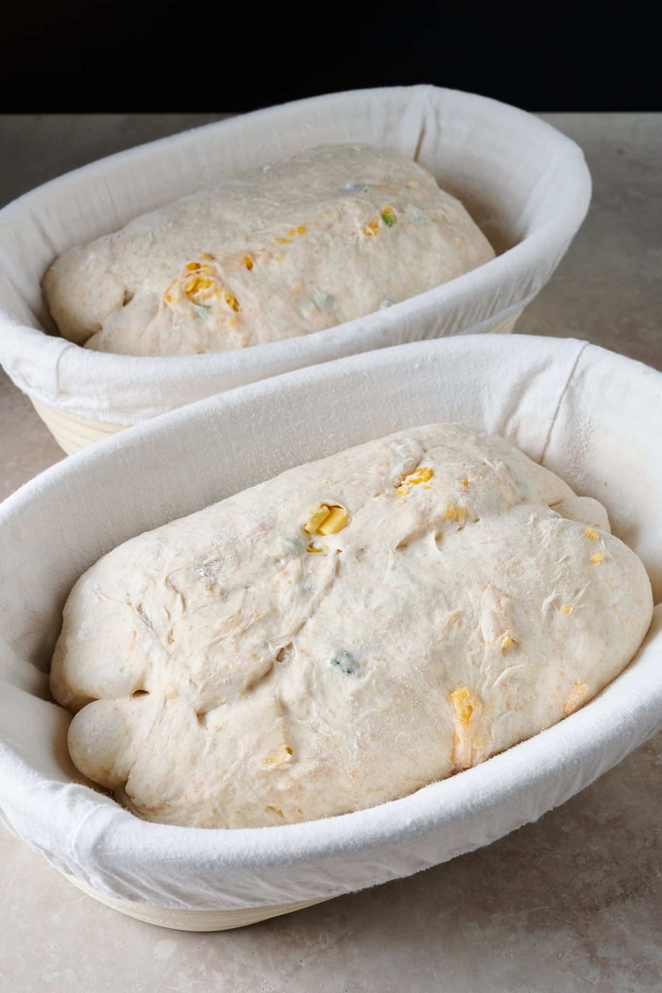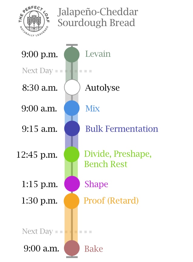 This jalapeƱo-cheddar sourdough bread is made over two days. Cold proofing this dough brings additional flavor, but you can always do a same-day bake. Instead of placing the shaped dough into the refrigerator to proof overnight (shape retarded), leave it covered for 1-3 hours (depending on kitchen temperatures, colder means longer) until ready to bake.