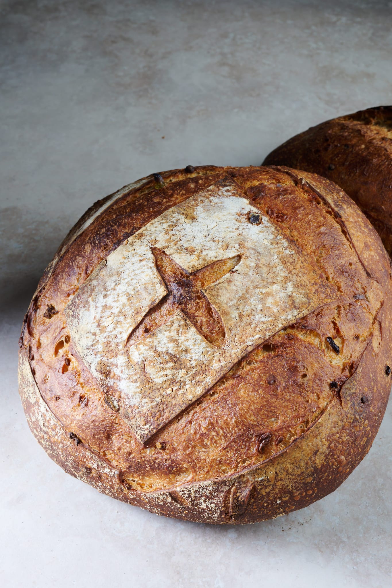 Score each piece of dough and slide it into the ovenābake for 20 minutes with steam. Then, remove the steaming pans from inside the oven (or remove the lid to your baking pan) andĀ bake for an additional 30 minutes, or until the crust is deeply colored and the interior temperature registers around 204°F (95°C).