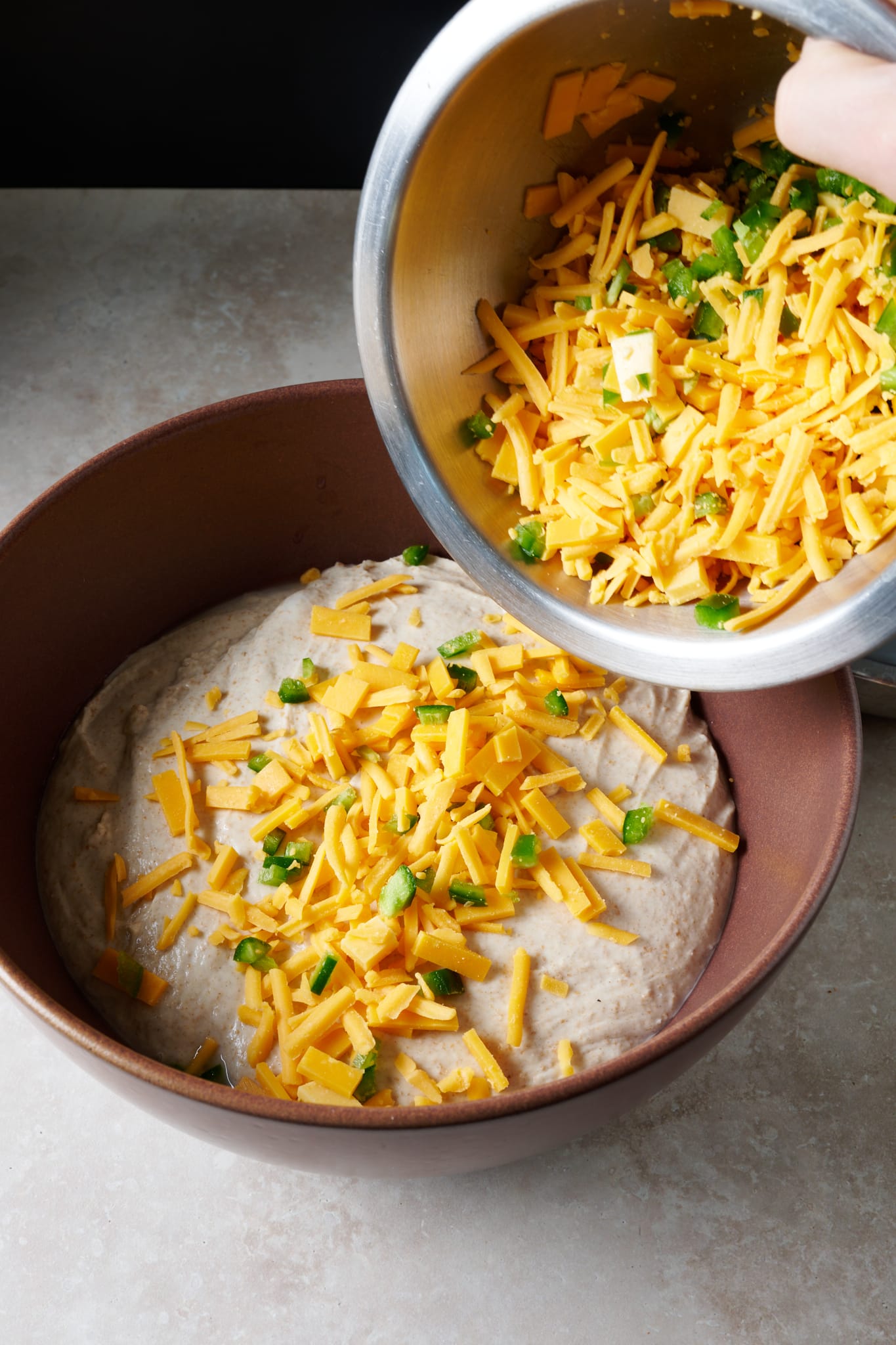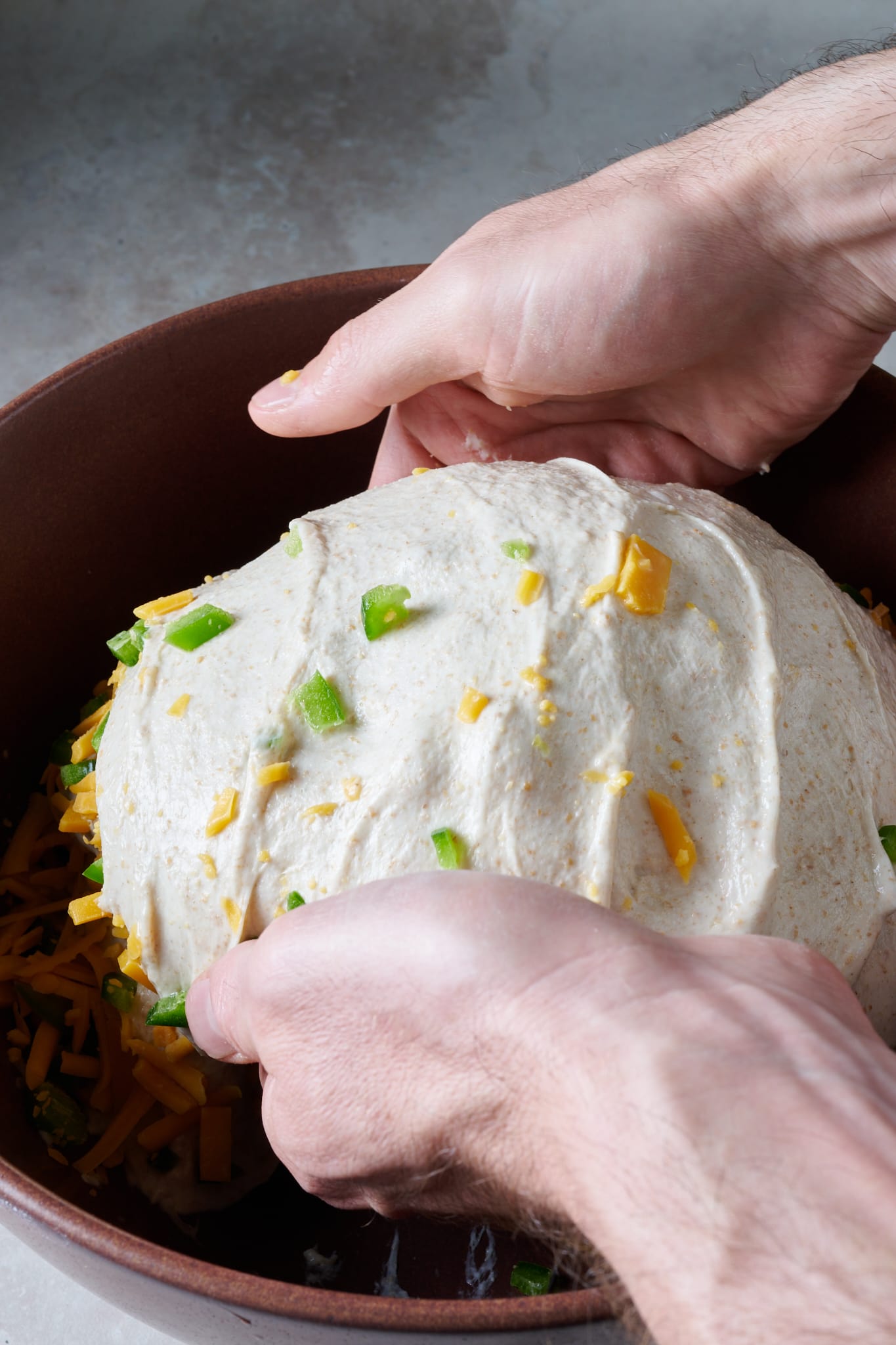 After the first thirty minutes into bulk fermentation, but before you give your dough its first set of stretches and folds, spread about 1/4 of the jalapeños and cheese over the top of the dough. Then, grab one side of the dough and stretch it up and over it to the other side. Next, spread on another 1/4 of the inclusions to the new top. Rotate the bowl 180° and perform another stretch and fold. Spread on another 1/4 of the inclusions, rotate the bowl 90° and do another stretch and fold. Finally, spread on the last of the peppers and cheese, turn the bowl 180°, and do one last stretch and fold.