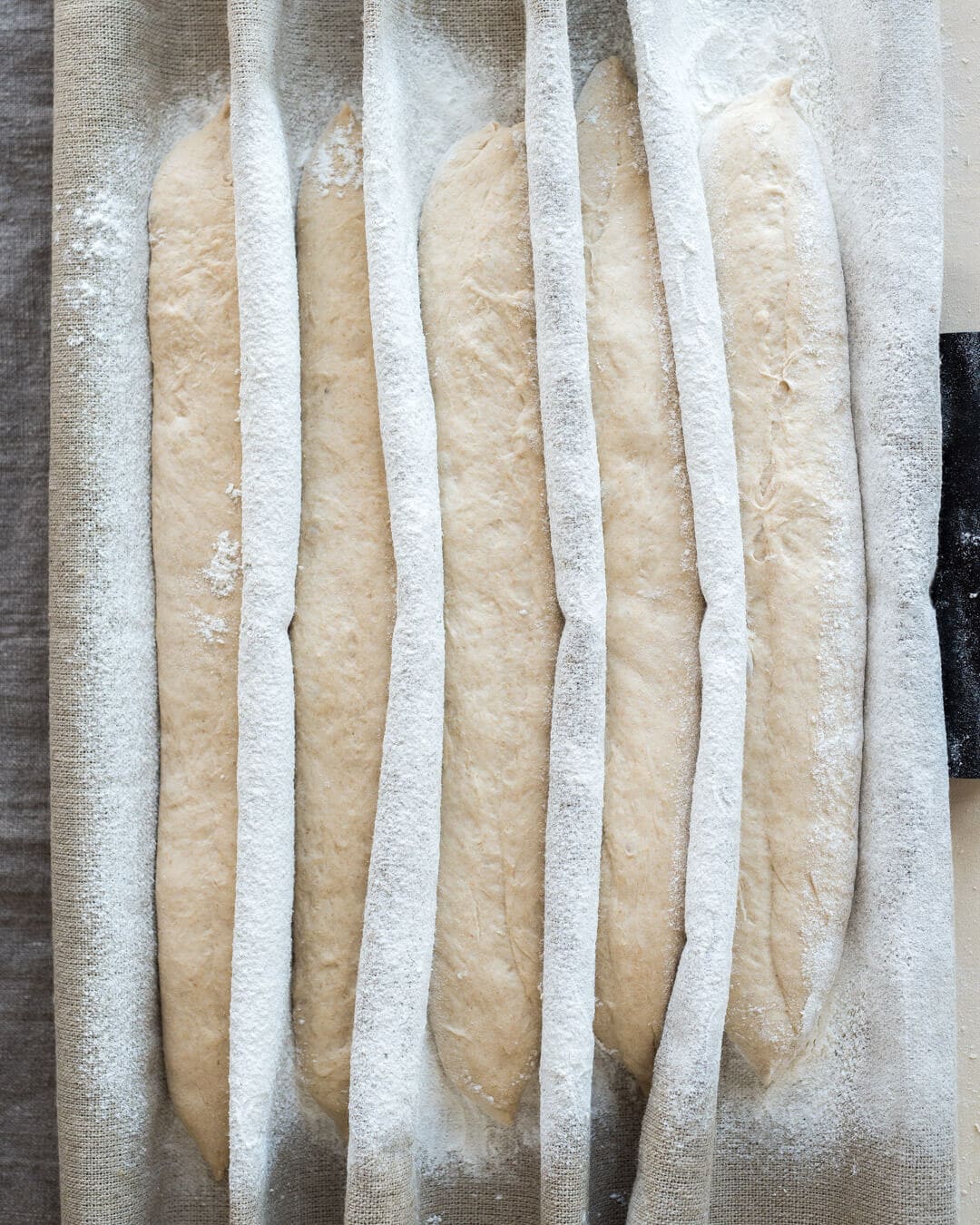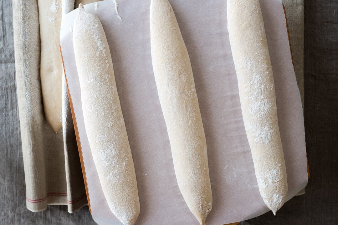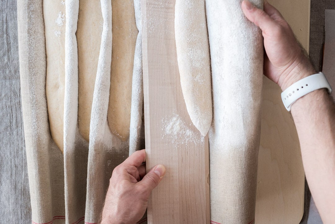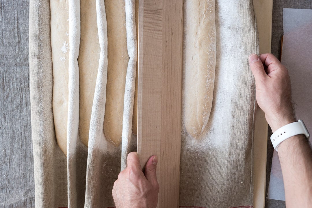 See the sections preparing a proofing surface (couche) and shaping baguettes near the beginning of this post for instructions on shaping this dough.