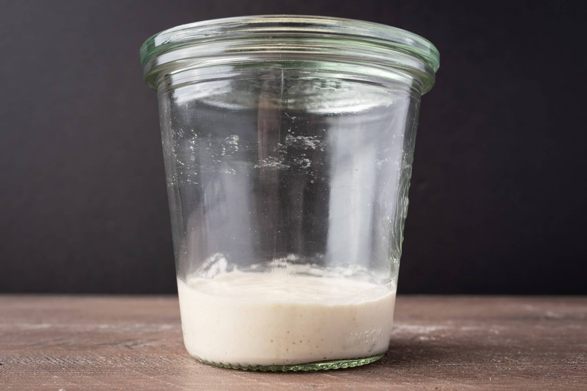The Weck 900 Tall Mold Jar – 1/5 Liter jars are perfect for holding this small starter. You can see above how much smaller these jars are smaller than my usual 3/4 liter jars holding my bigger sourdough starter. Inside the jar on the left, you’ll see the small amount of ripe starter I use to keep my culture going—just 5g (more on this below).