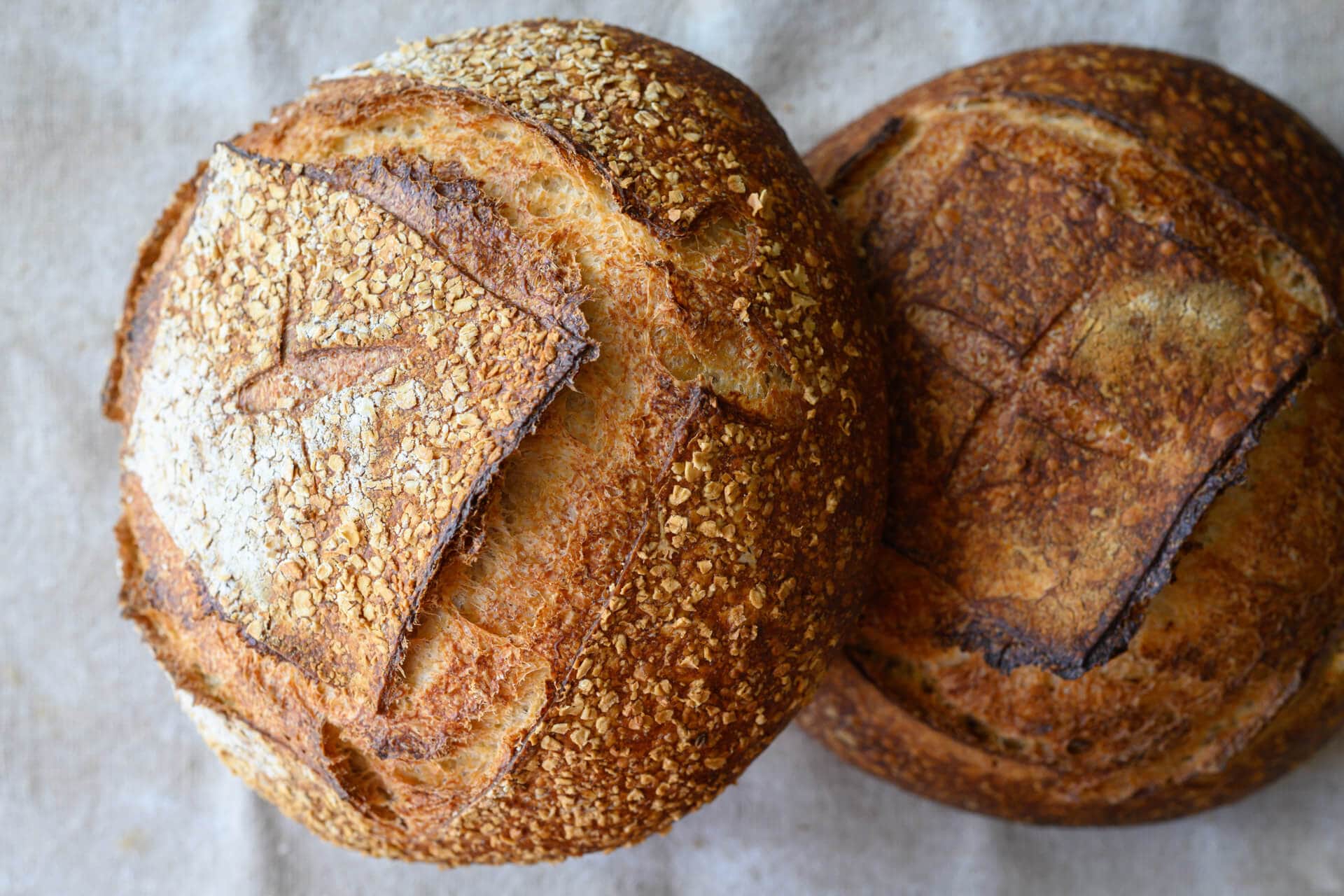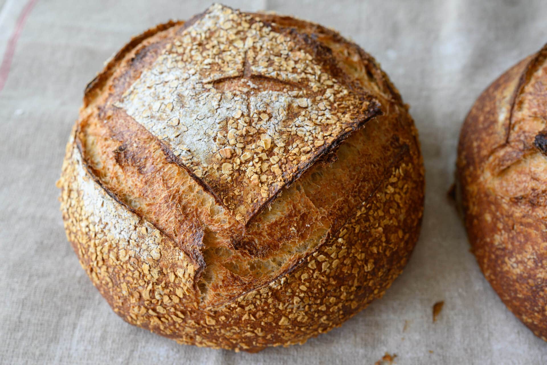 Congruent with my last pan loaf post, I’ve been using quick-cooking oats to top many of my loaves. I did the same here for one of my boules, and I’m still loving their texture and added nutrition, but this is optional.