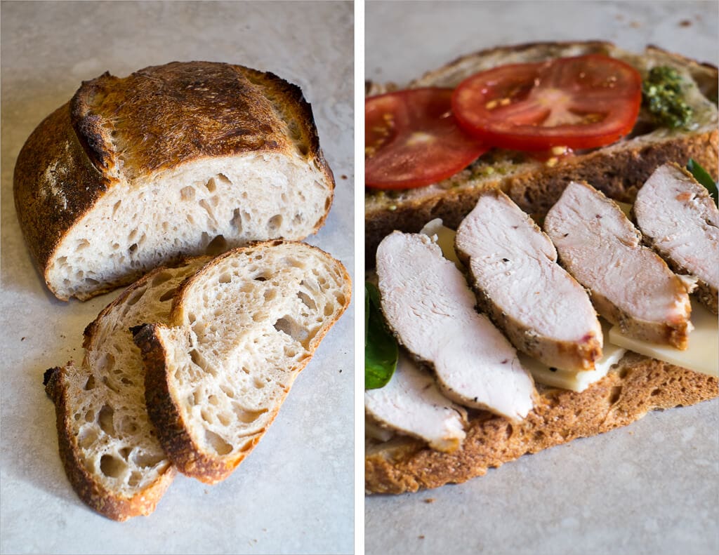 Light and soft with only the smallest hint of sour. This is the sourdough I love. Slicing up the bread to make a grilled chicken, pesto, swiss, and tomato sandwich for lunch was a real treat indeed. Later that evening I enjoyed a thick pan-grilled slice with chopped avocados, cherry tomatoes, and a dab of extra virgin olive oil.