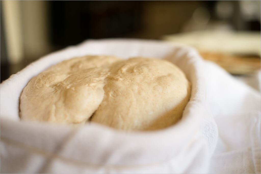 Thanks to my strong starter, by the end of the bulk fermentation step I noticed the dough was very aerated with lots of little air bubbles and correctly pulling from the sides of the container. The dough was definitely ready for shaping. I performed my usual shaping, one smaller chunk of dough as a boule and the other larger chunk as a batard. After shaping when the boule and batard were placed into their bannetons, they were jiggly and full of air. I knew I was on the right track with these two.
