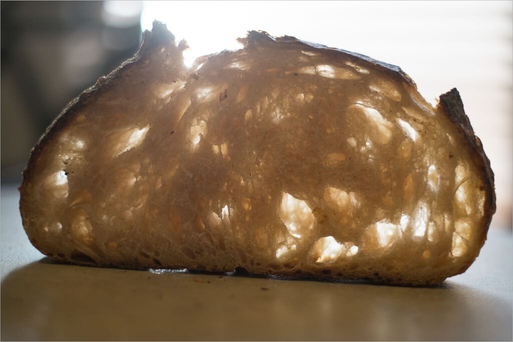 Beautiful and soft, the crumb was so light I was shocked when first biting into it. You can literally see the oven spring movement from the bottom of the loaf to where the score was done down the middle. The soft and perfectly cooked crumb came the closest thus far to my ideal loaf.
