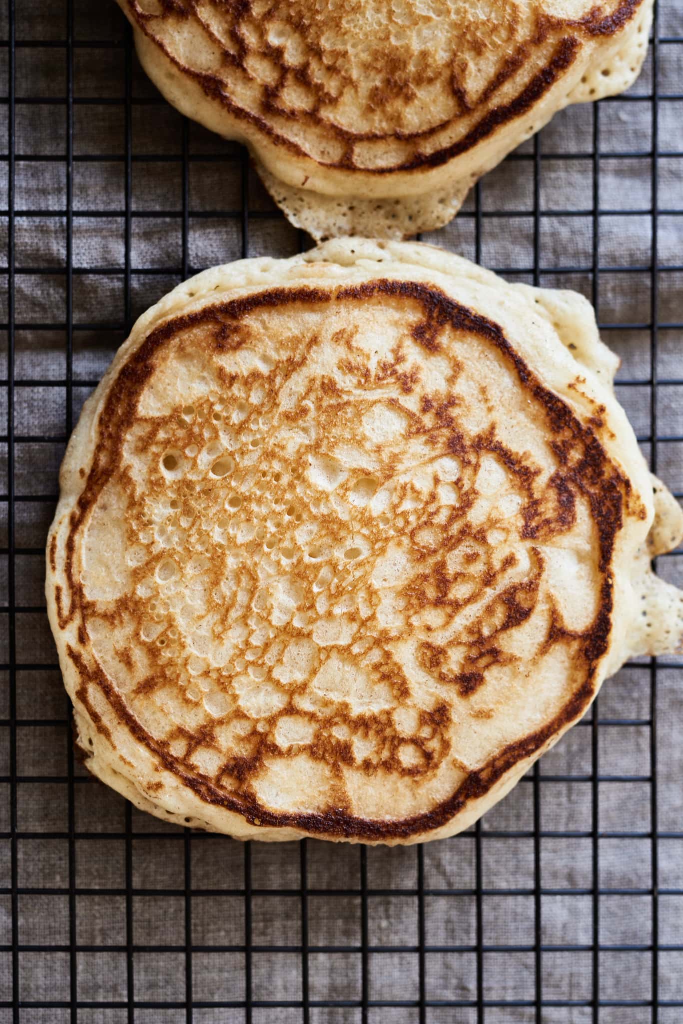 When cooking, let the pancakes cook on the first side until bubbles form on top that keep their shape and don’t close. You’ll also know the pancakes are ready to flip when the edges turn slightly darker than the rest of the batter. Quickly and decisively, flip the pancakes and let them finish cooking on the other side—no more flipping!