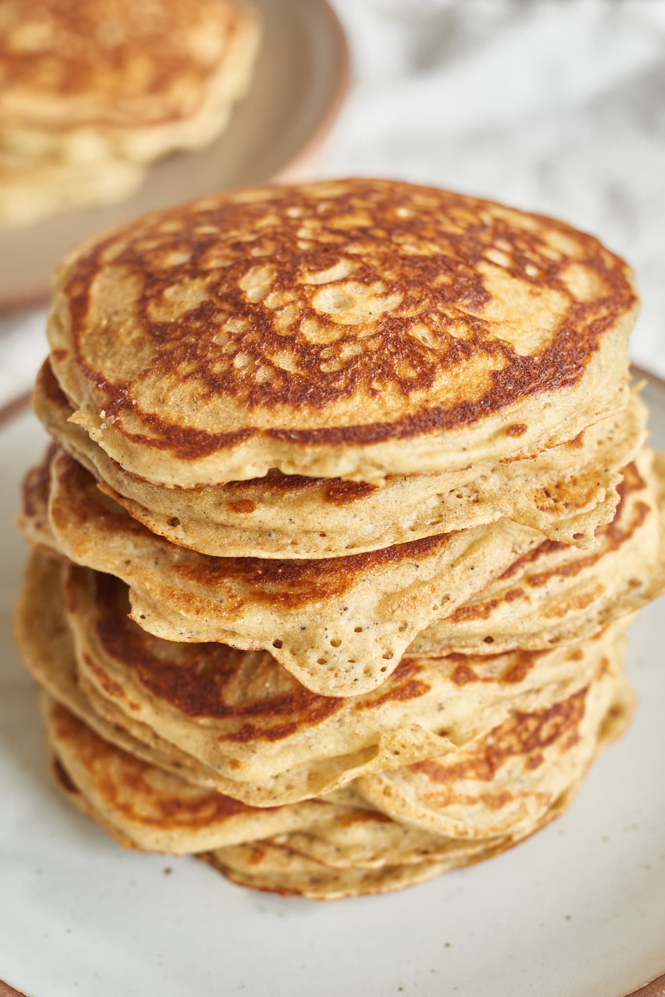 Yes, these pancakes freeze exceptionally well. After cooking them and allowing them to fully cool, stack them in a plastic freezer bag and freeze them. If frozen when they’re thoroughly cooled, they won’t stick together. To eat, take one or two out, microwave them for 10 to 20 seconds, then heat them briefly in a toaster (this keeps them from getting soggy).
