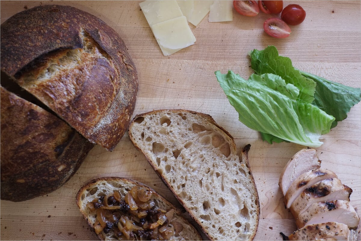 I mentioned earlier that I used a few slices of this bread to make an insanely good sandwich, this is a sandwich I would serve at a restaurant, and I know it’d be a hit. We cooked a recipe recently using caramelized onions, currants, and a paste made from harissa and water. I spread this concoction on one side of the bread, topped it with grilled chicken, tomato, lettuce, and some creamy cheese. Gone in an instant!