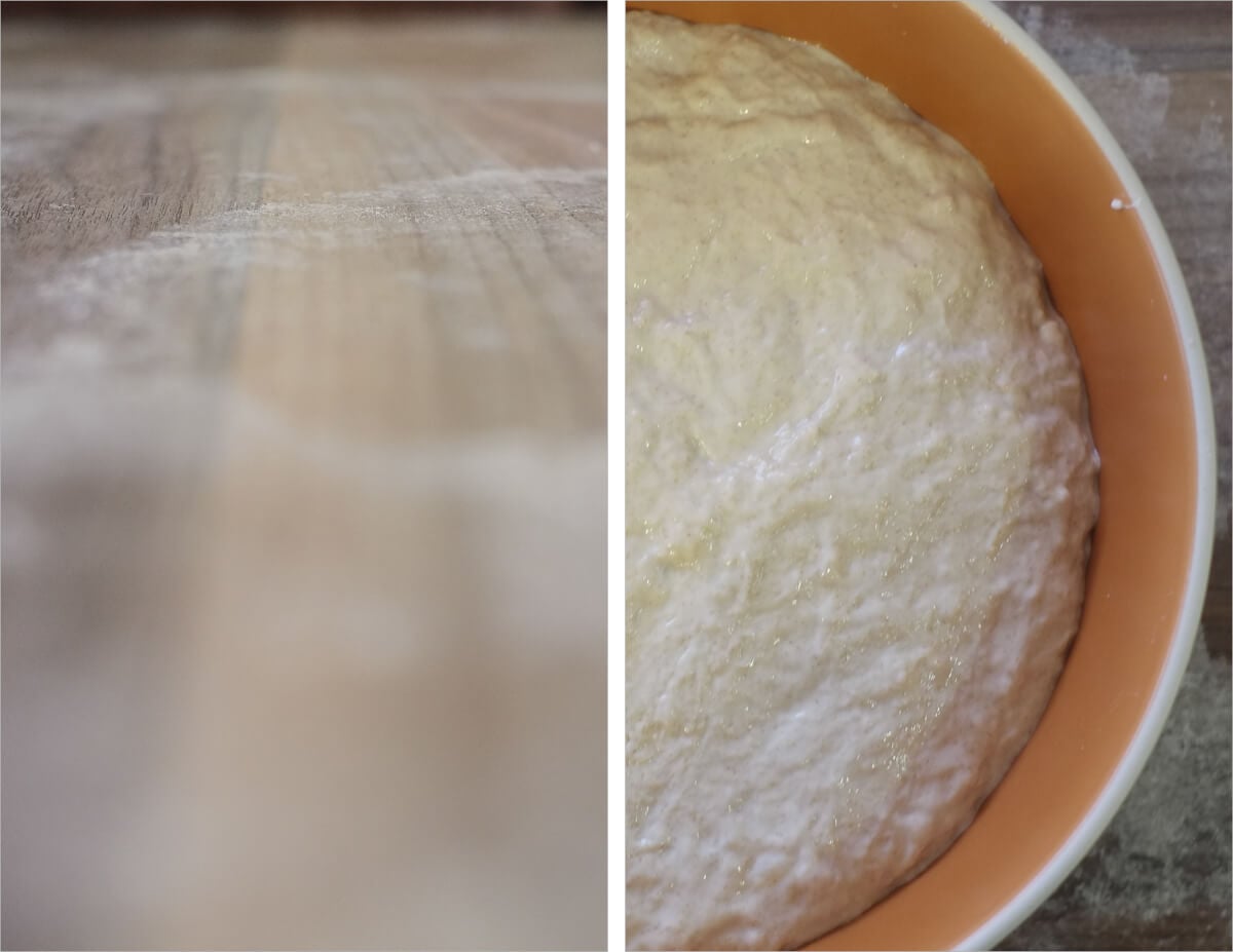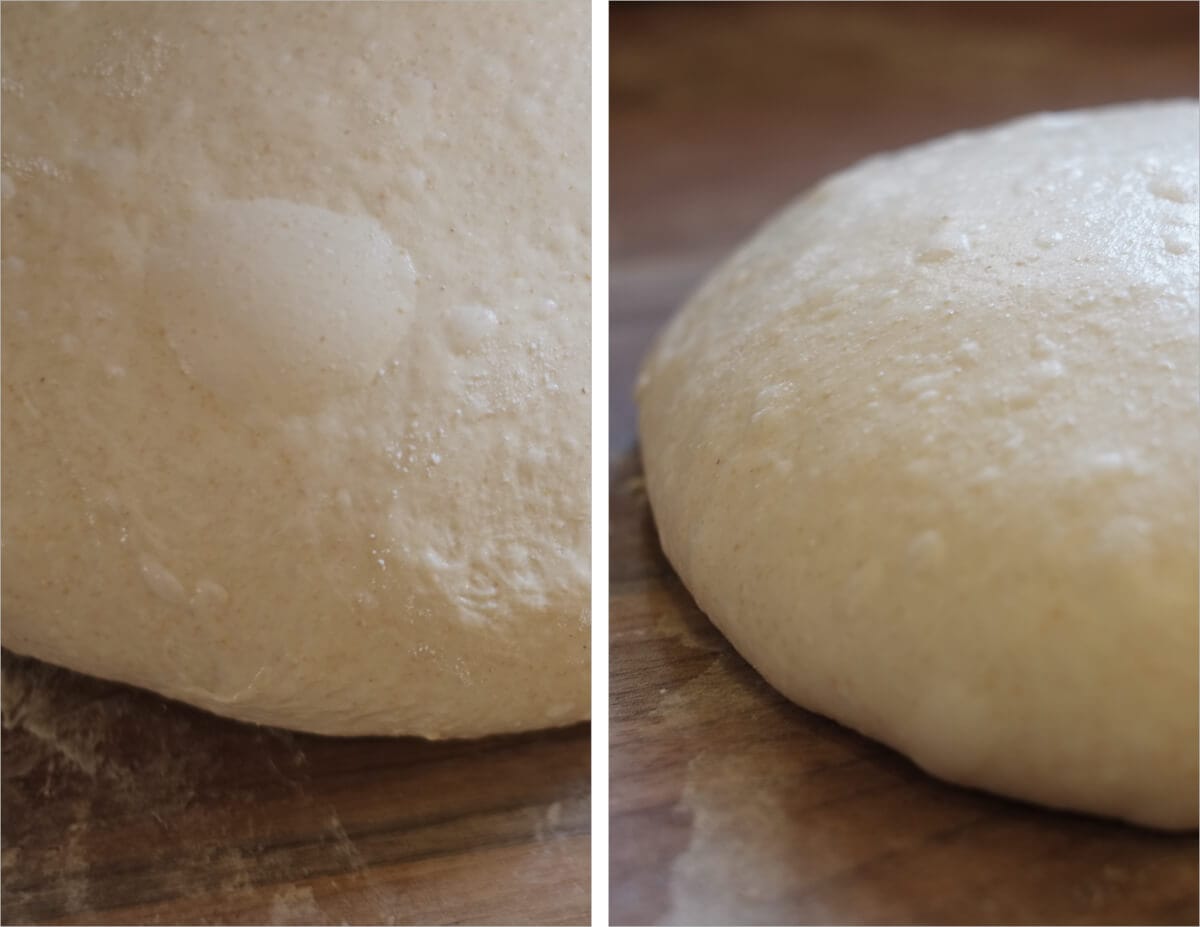 Take the dough out of the container onto your work surface and sprinkle some flour on top before dividing. Divide the mass into two halves and lightly spin each half with your dough knife in one hand and your other hand. Let this pre-shape rest, covered with a damp towel or inverted bowls, for 20 minutes.