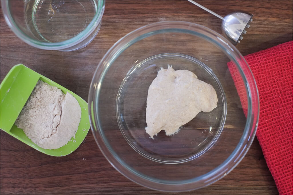 After six hours mix an additional 125g water and 175g levain in a separate bowl. Mix these until you’ve fully dissolved the levain in the water.