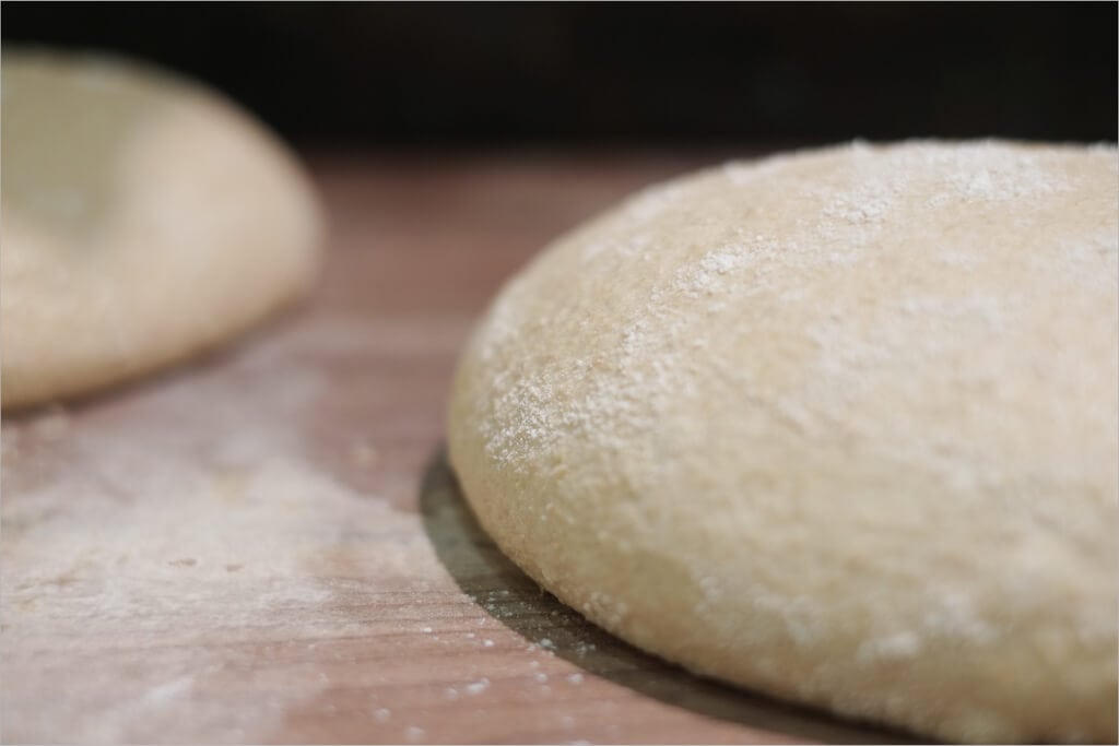 Take the dough out of the container onto your work surface and sprinkle some flour on top before dividing. Divide the mass into two halves and lightly spin each half with your dough knife in one hand and your other hand. Let this pre-shape rest for 20 minutes.