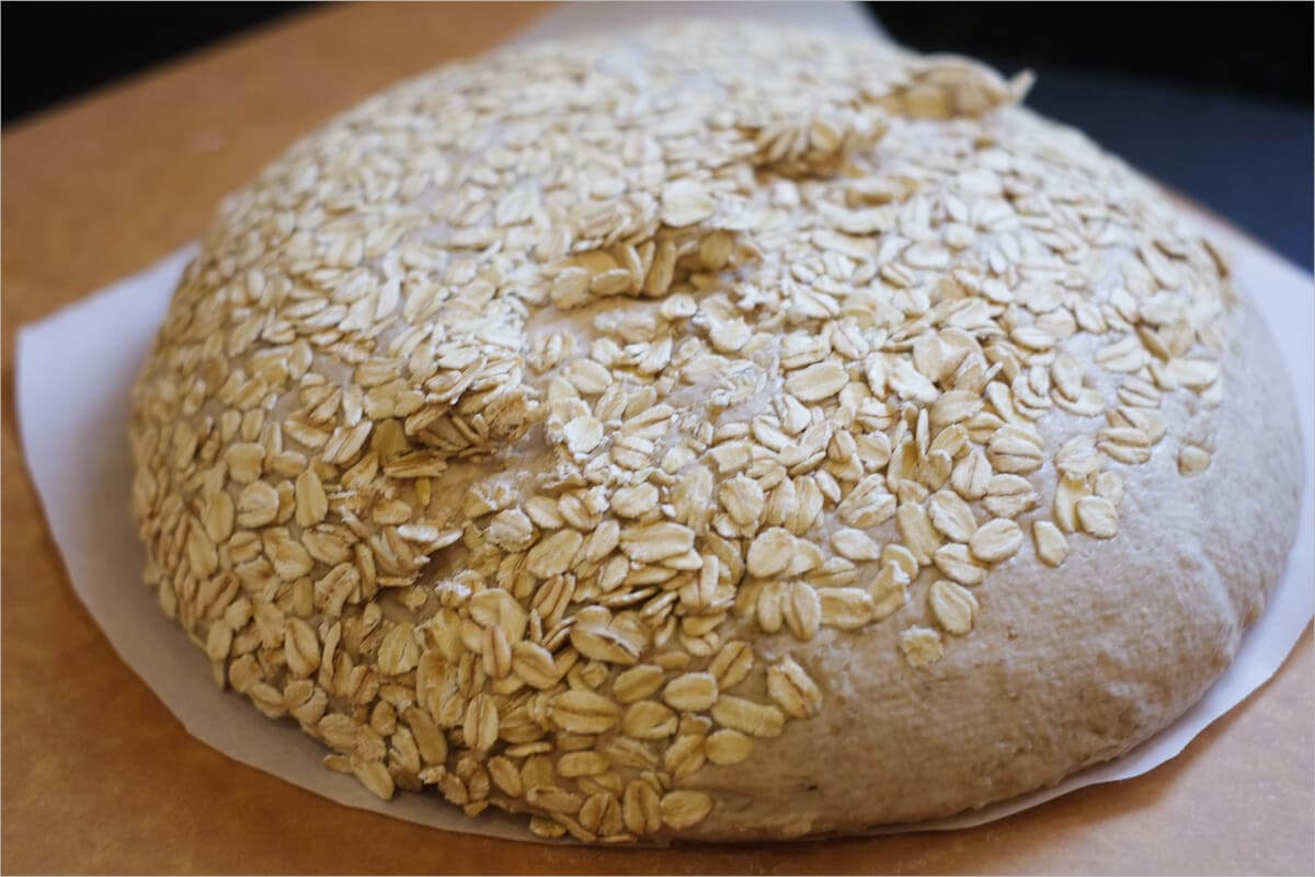 Take a clean kitchen towel and lay it on the counter. Spread flat some of the uncooked rolled oats onto the towel in a circle about the size of your desired finished boules. After shaping, you’ll quickly plop the shaped boule on top of these oats to coat the surface before placing into your proofing baskets, creating a nice dotted surface with a touch of crunch after baking.