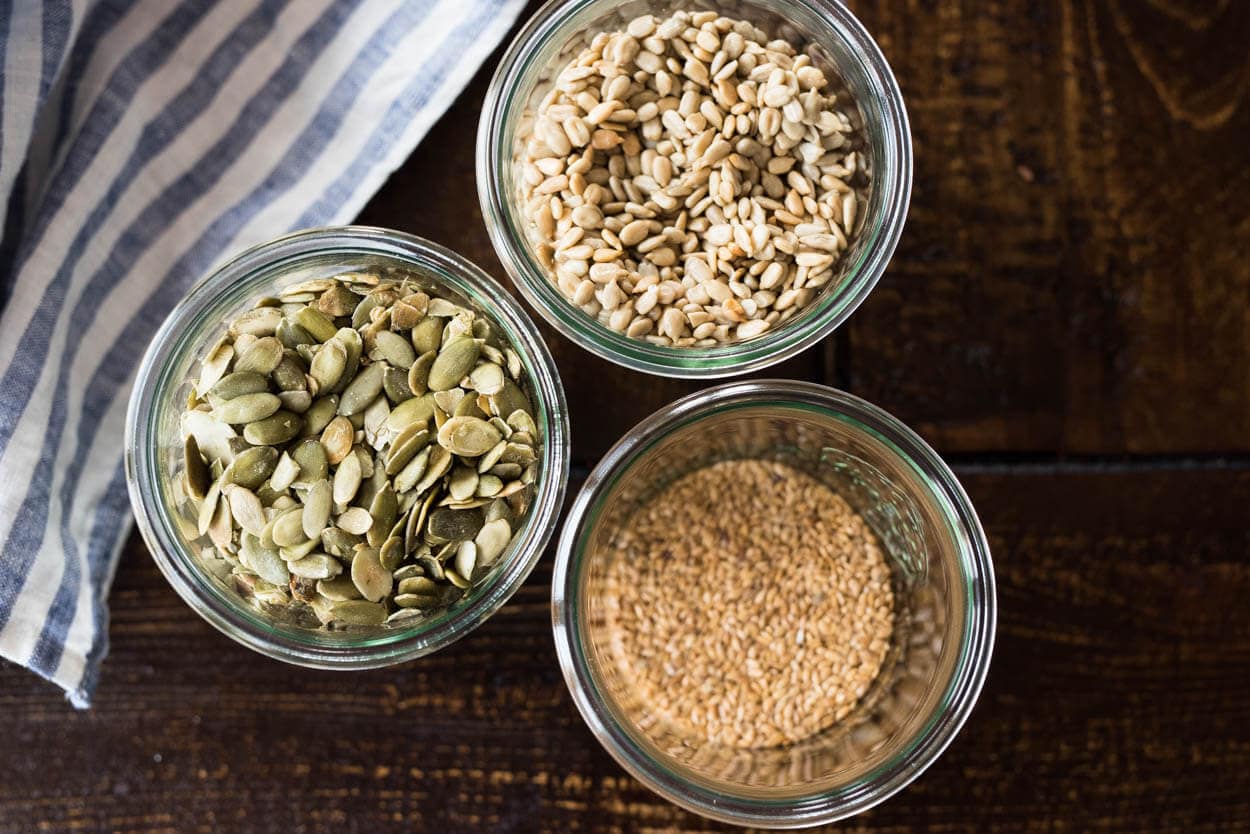 Spread the seed mixture out in a single layer on a rimmed baking sheet lined with parchment paper (save this when done toasting the seeds to use it later when you bake the bread) or a silicone mat and toast at 350°F (175°C) for 15 minutes. Toss around once midway through and keep an eye on them towards the end, seeds can go from toasted to burned rather quickly.