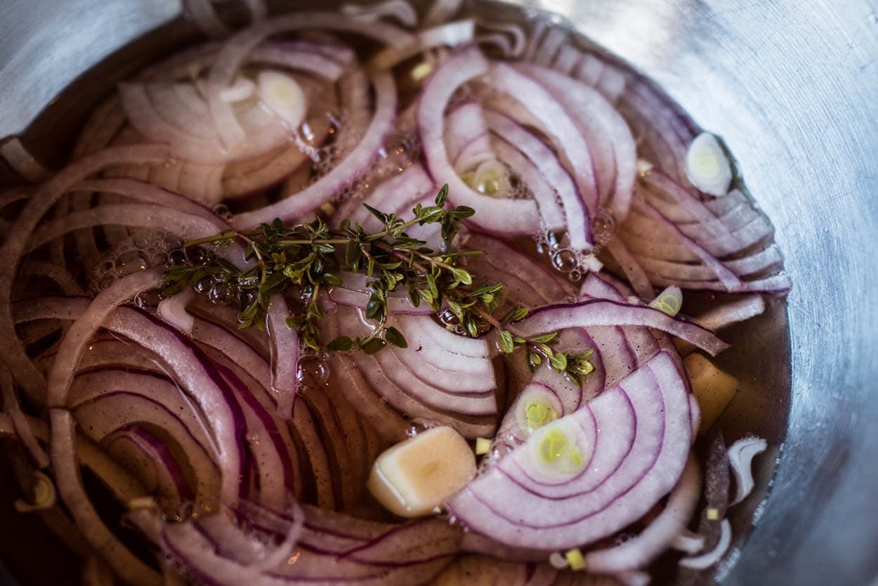 - Once boiling, pour the hot brine over the red onions in a small bowl, or directly in their final glass storage jar (make sure the onions are completely submerged)