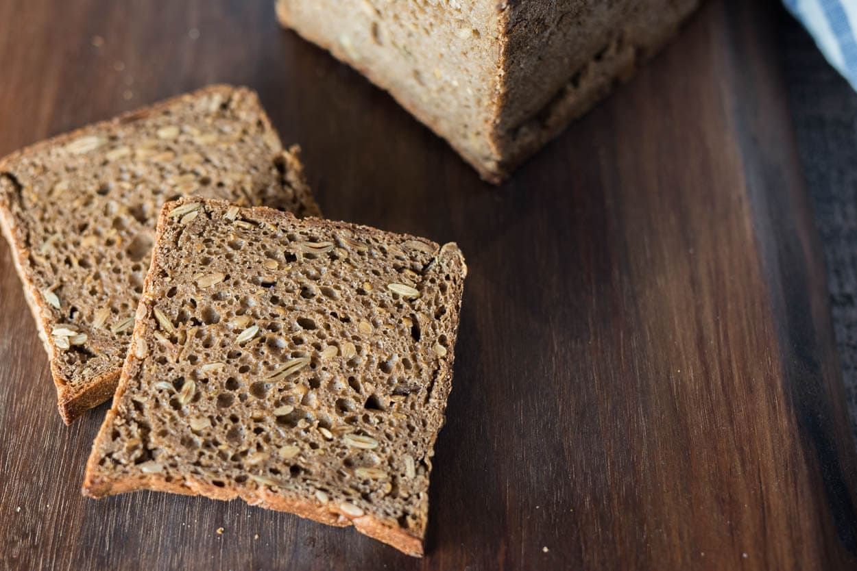 I baked this bread the entire time with the lid on. Place the Pullman pan on a baking sheet lined with a silicone mat (or the recycled parchment paper when you toasted your seeds) and bake for 35 minutes at 400°F (200°C). Turn the heat down to 350°F (175°C) and bake for 1.5 to 2 hours until the internal temperature reaches 208-210°F (97-98°C). Check the loaf occasionally in the last 20 minutes to check for doneness.