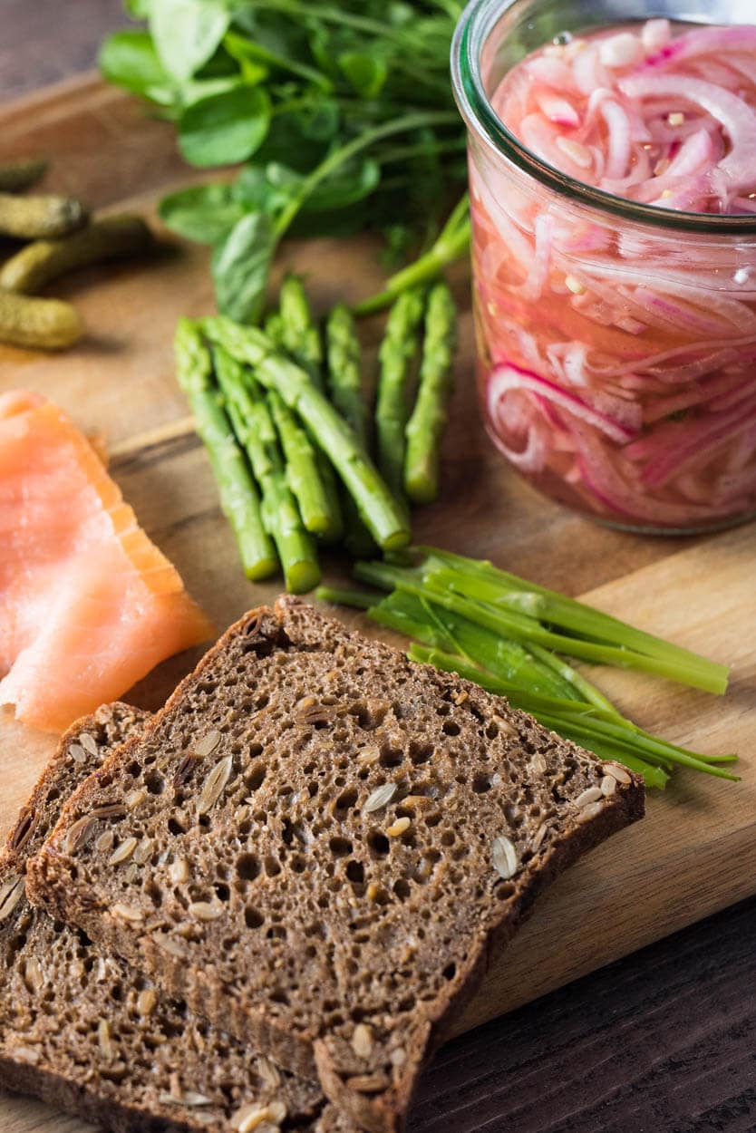 In this post, I’ve included my rye sourdough recipe, quick pickled red onions, and a couple of smørrebrød that were inspired by The Nordic Cookbook.
