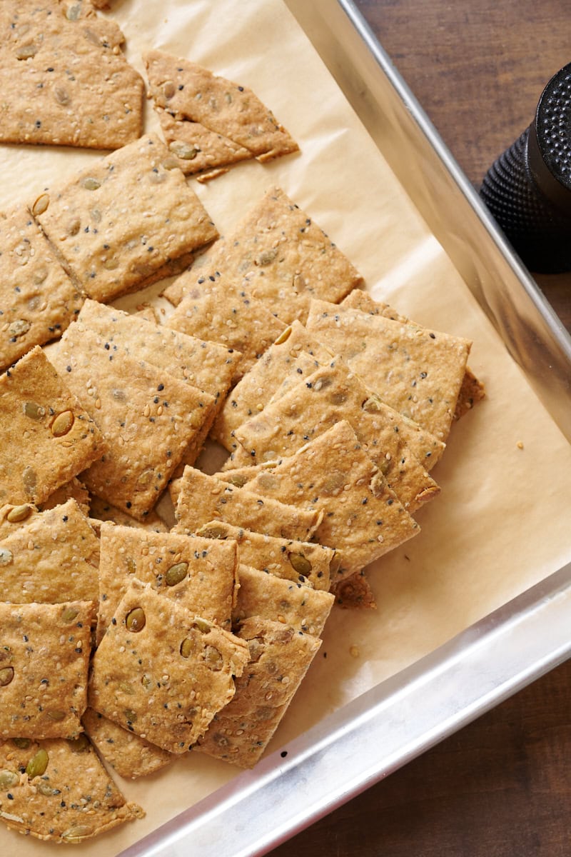 Neutral oil is common in baking treats like cakes and quick breads to bring tenderness and richness without drawing attention away from the other delicate flavors in the bake. Since these crackers are already relatively neutral in flavor, save for the tang from the discard and nuttiness from the seeds, olive oil is perfect here (and in many other bakes, of course). There’s no need to use your fanciest finishing oil, but opt for the nicest option you feel comfortable cooking with.