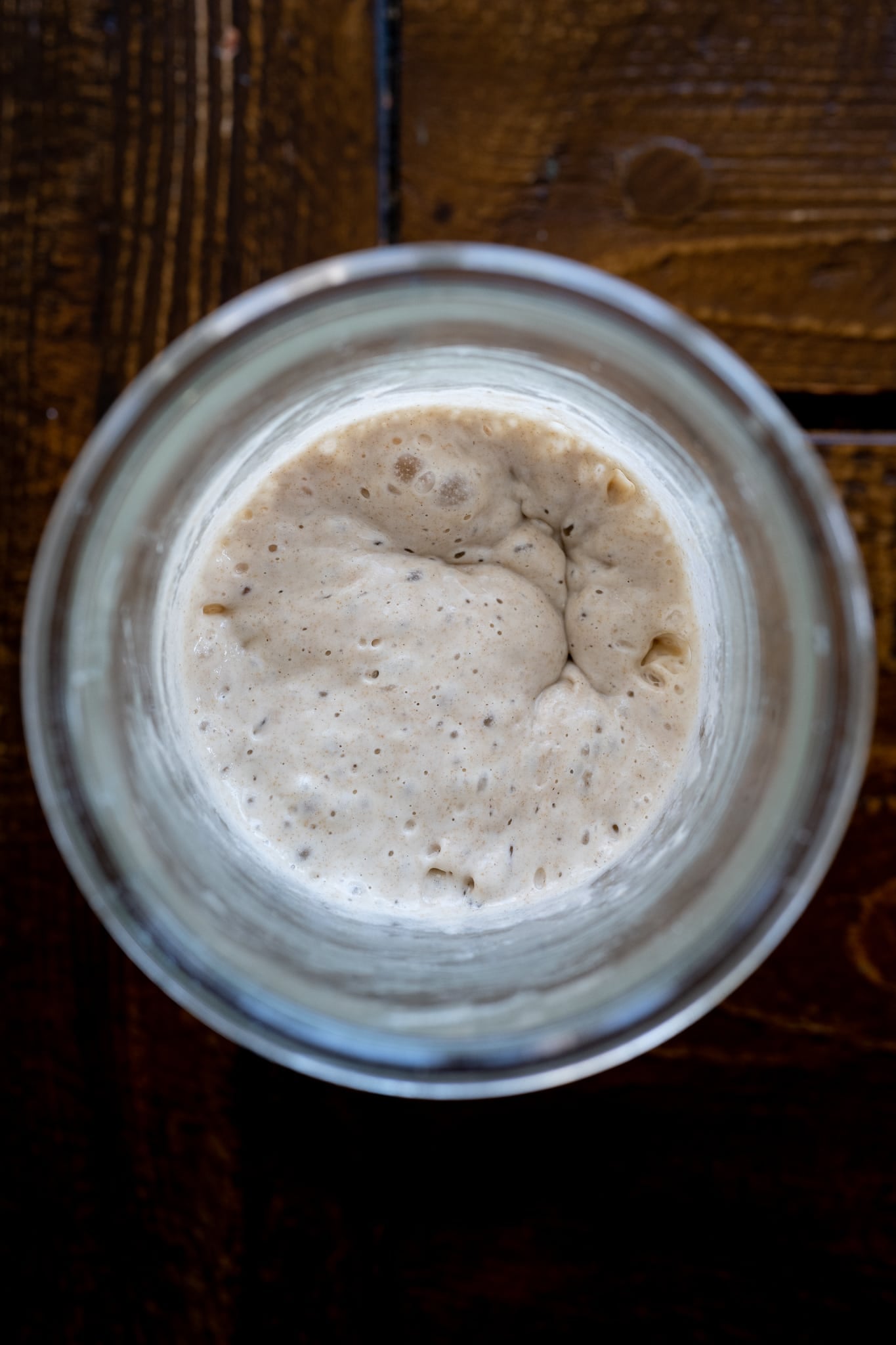 Your overnight levain should look nice and ripe (see image at side). It will have a sour aroma, be bubbly on top and at the sides, have risen to some degree (with perhaps some collapse), and generally, be a much looser consistency than when you mixed it the night before.