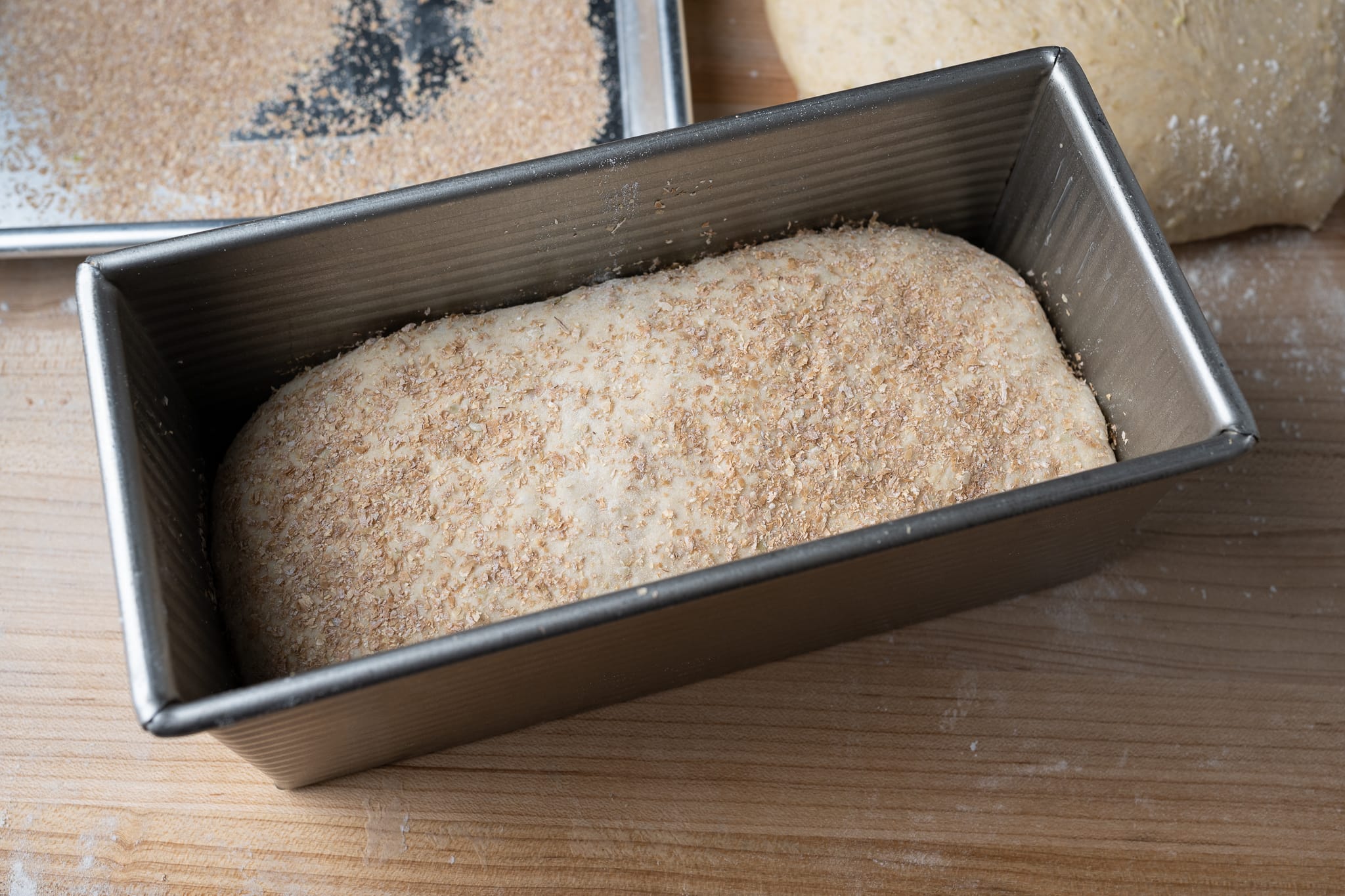 Butter two 9x4x4″ Pullman pans. Shape each round of dough into a long tube to fit each pan. If desired, roll each piece of dough in any of the Optional Toppers, then place the dough, seam side down, in the Pullman pan. - Proof (1:00 p.m. to 3:00 p.m.)