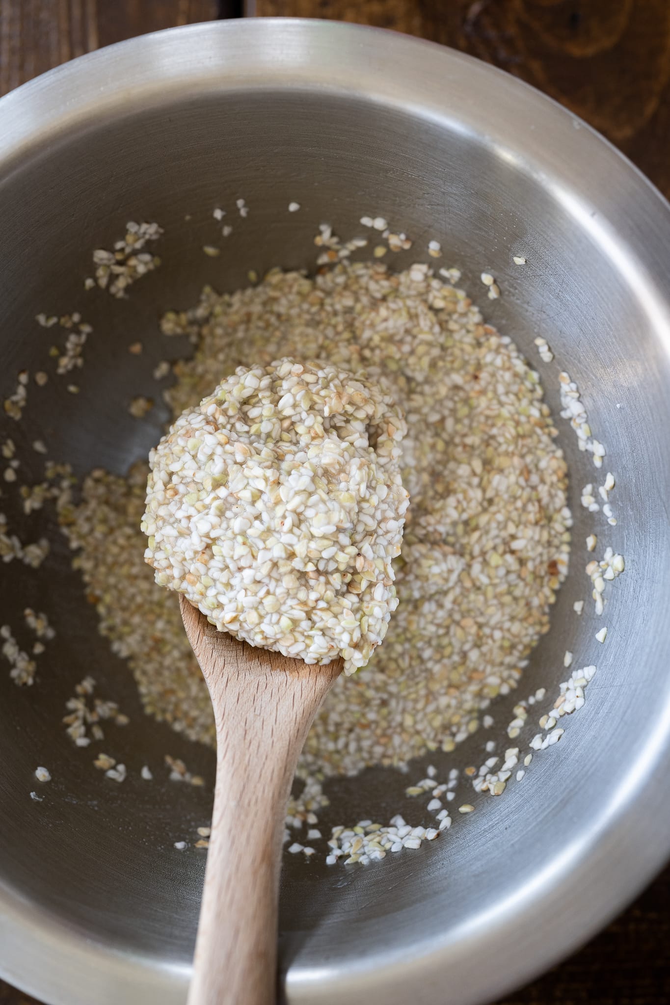 To make the porridge, weigh out the called for cracked buckwheat into a bowl and pour boiled water over the top (the exact weights are listed in the recipe below). Mix so everything gets wet, and let the mixture rest until called for at the end of mixing. If you forget to make this porridge early, stick the bowl in the freezer to rapidly chill the mixture and avoid mixing a hot porridge into your dough (throwing off your final dough temperature).