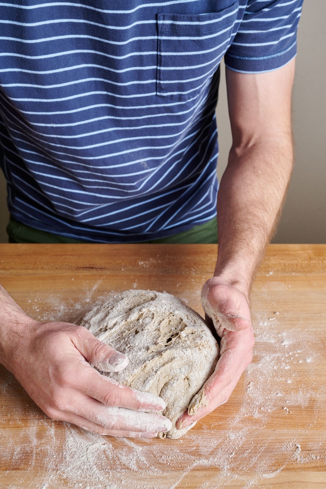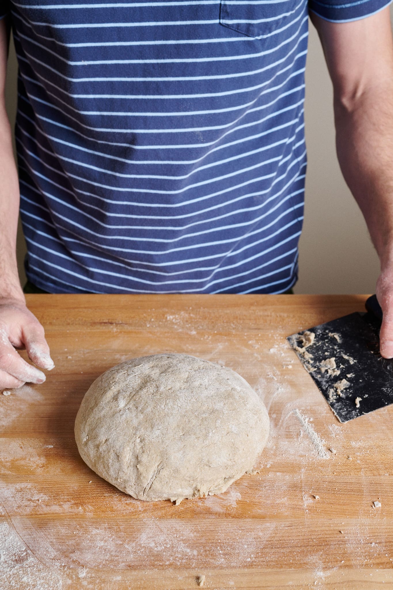 Using your floured hands, flip the dough over and quickly and confidently round it until it gets into a rough ball shape. It does not have to be a perfect ball. Just do your best to gather it with as few motions as possible.