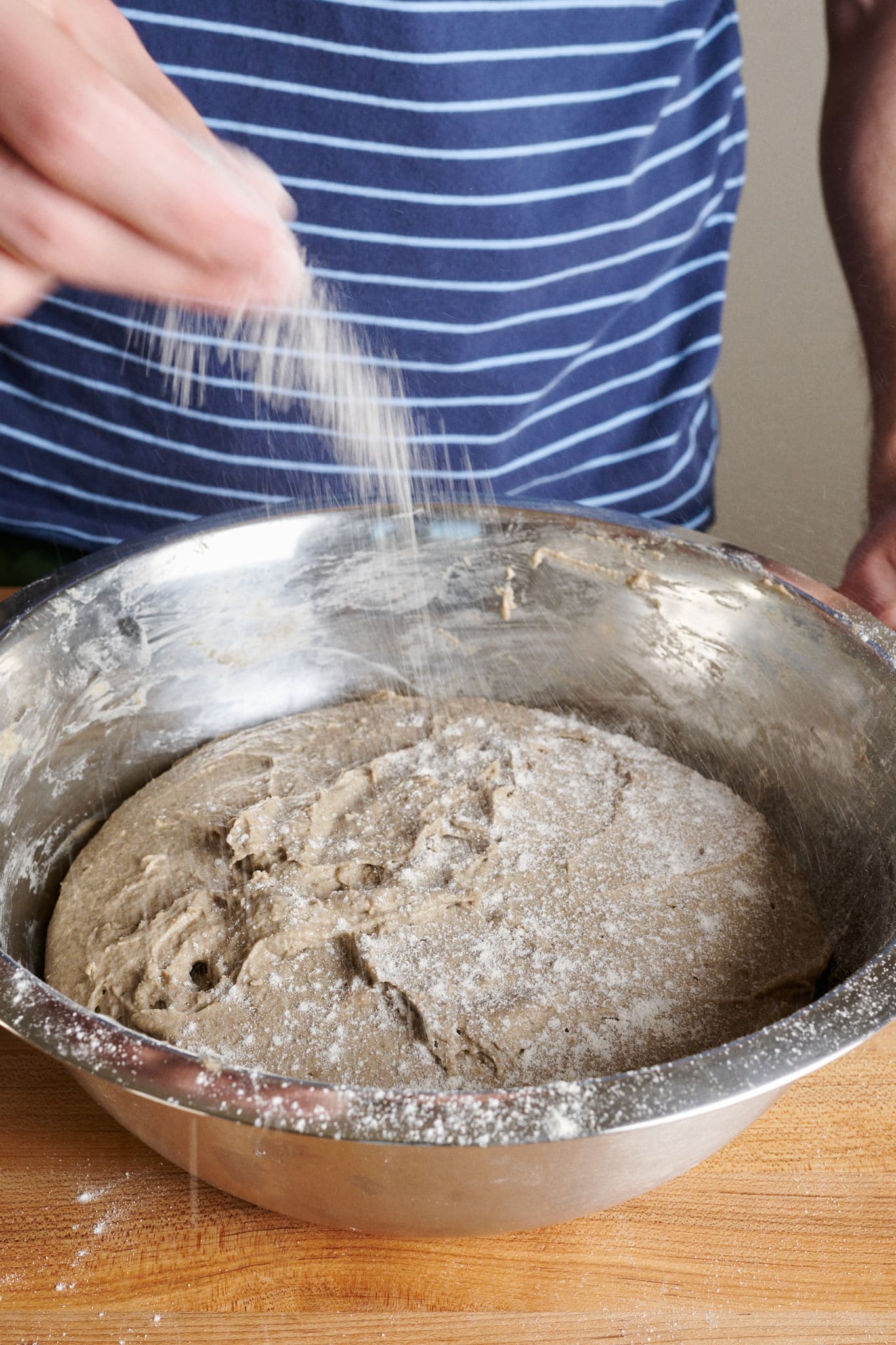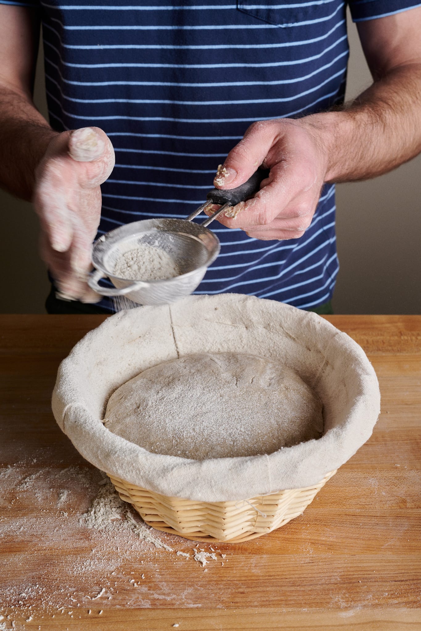 Prepare an 8-inch round proofing basket or banneton by liberally dusting on whole rye flour. Be sure the entire surface area of the basket’s interior is covered with flour.