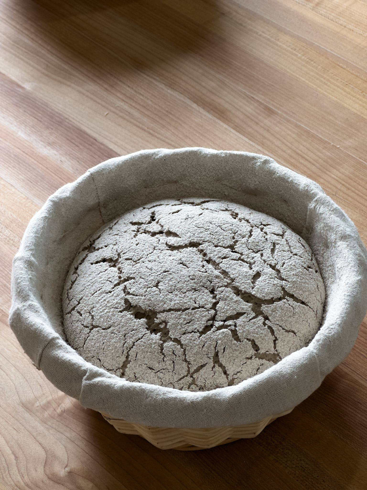 Dust the top of the dough with more whole rye flour in an even layer. This will eventually crack open as the dough proofs. Cover the basket with a reusable plastic cover for an air-tight seal.