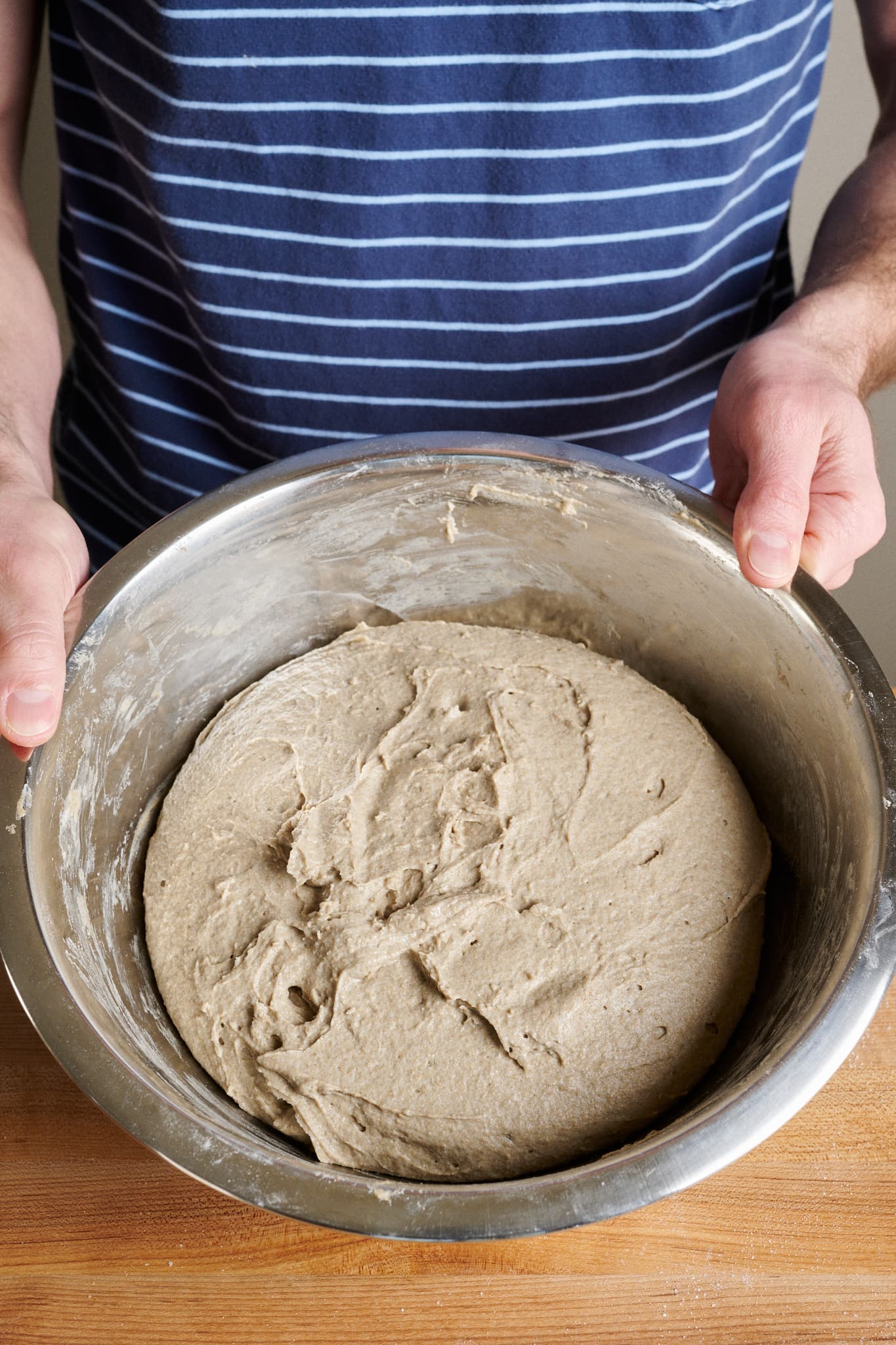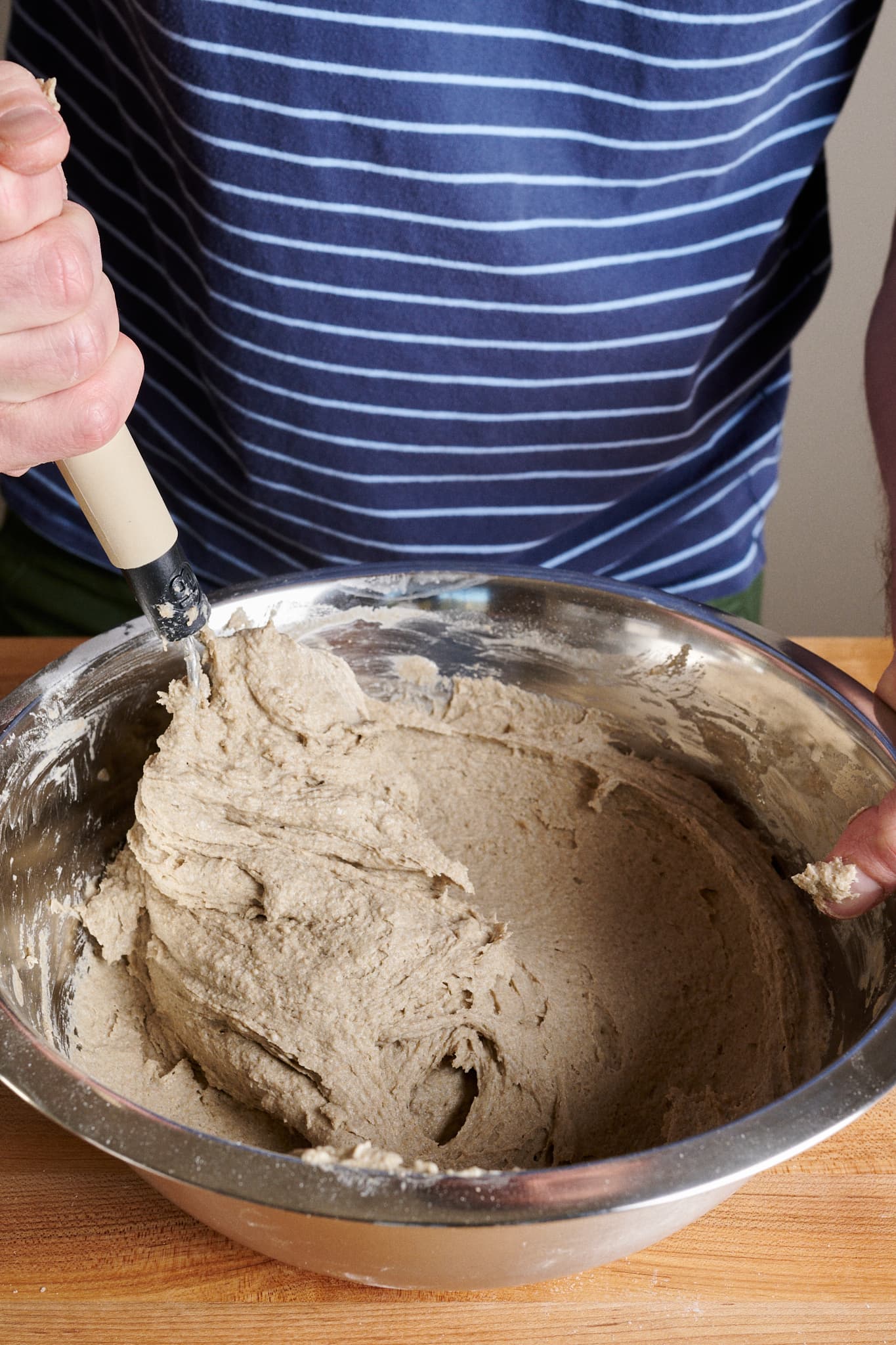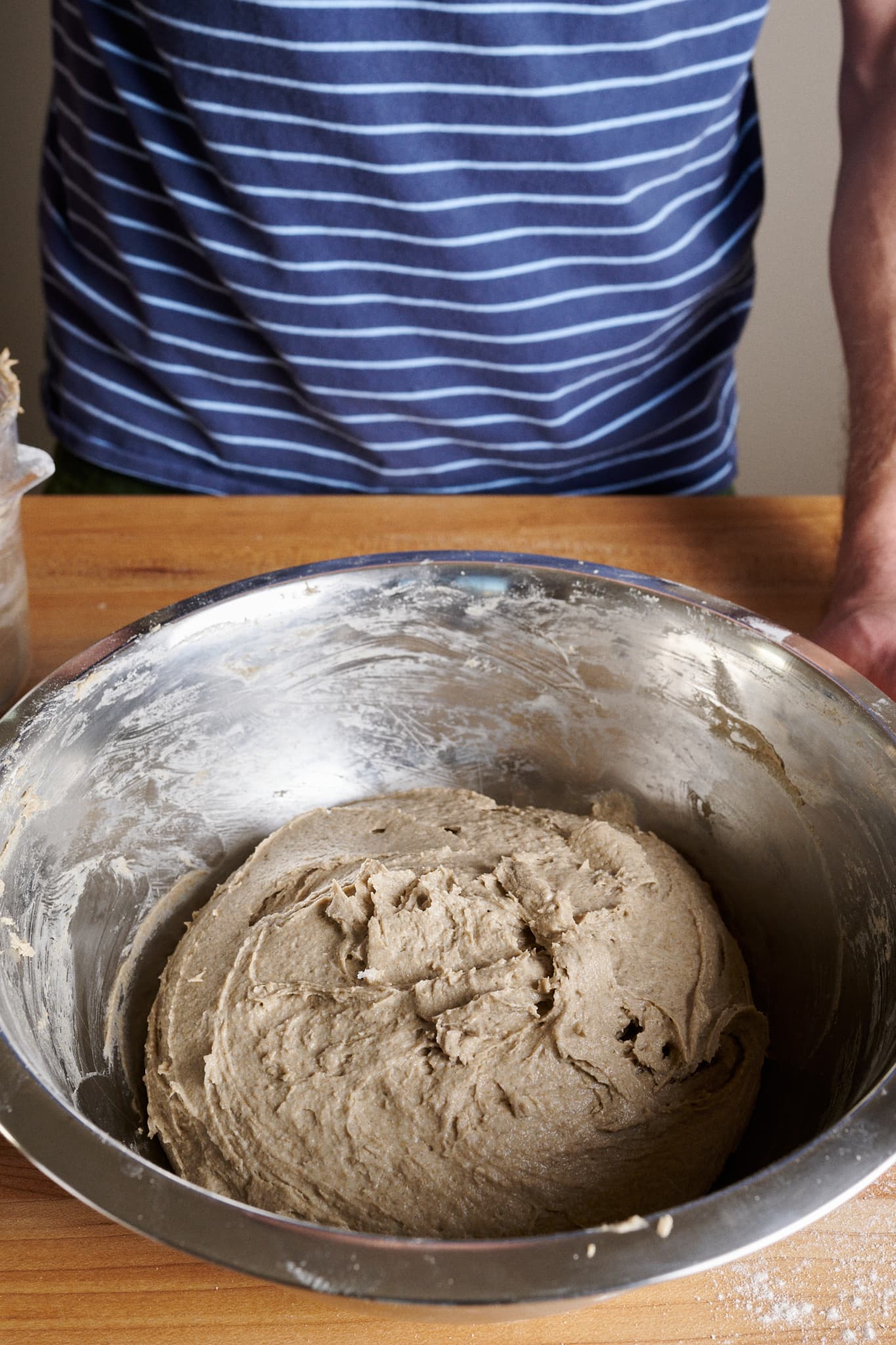 Place the flour, water (see note above), salt, and levain in a large bowl. With wet hands (or, my preference, using a sturdy dough whisk), mix thoroughly until no dry bits remain (see below, left). Rye does not benefit from mixing and kneading in the same way as wheat due to its low gluten content. Therefore, it’s only necessary to mix this dough until no dry flour remains.