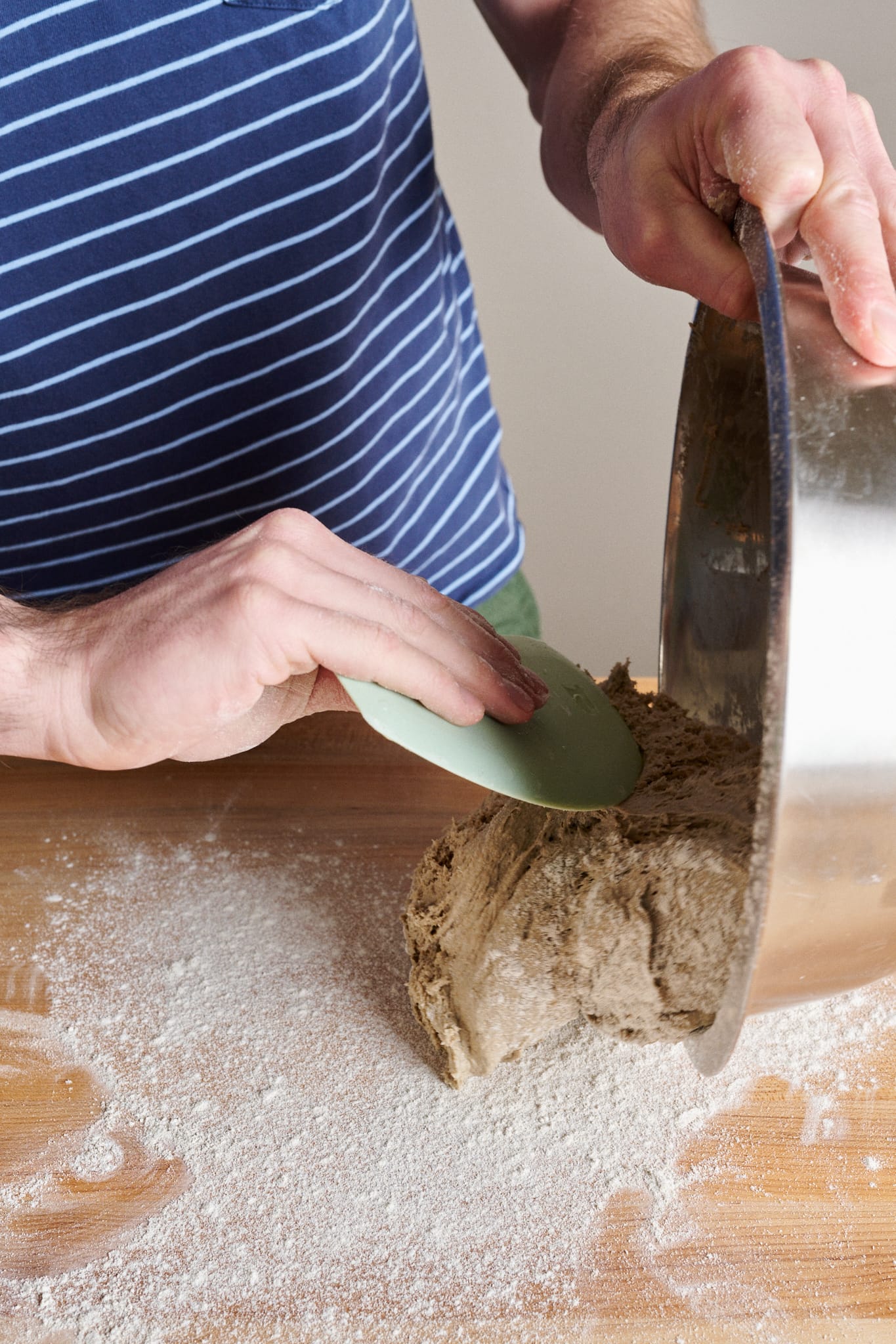 Flour your work surface, the top of the dough in the large bowl, and your hands. Scrape the dough onto the floured work surface with the floured top of the dough facing down.