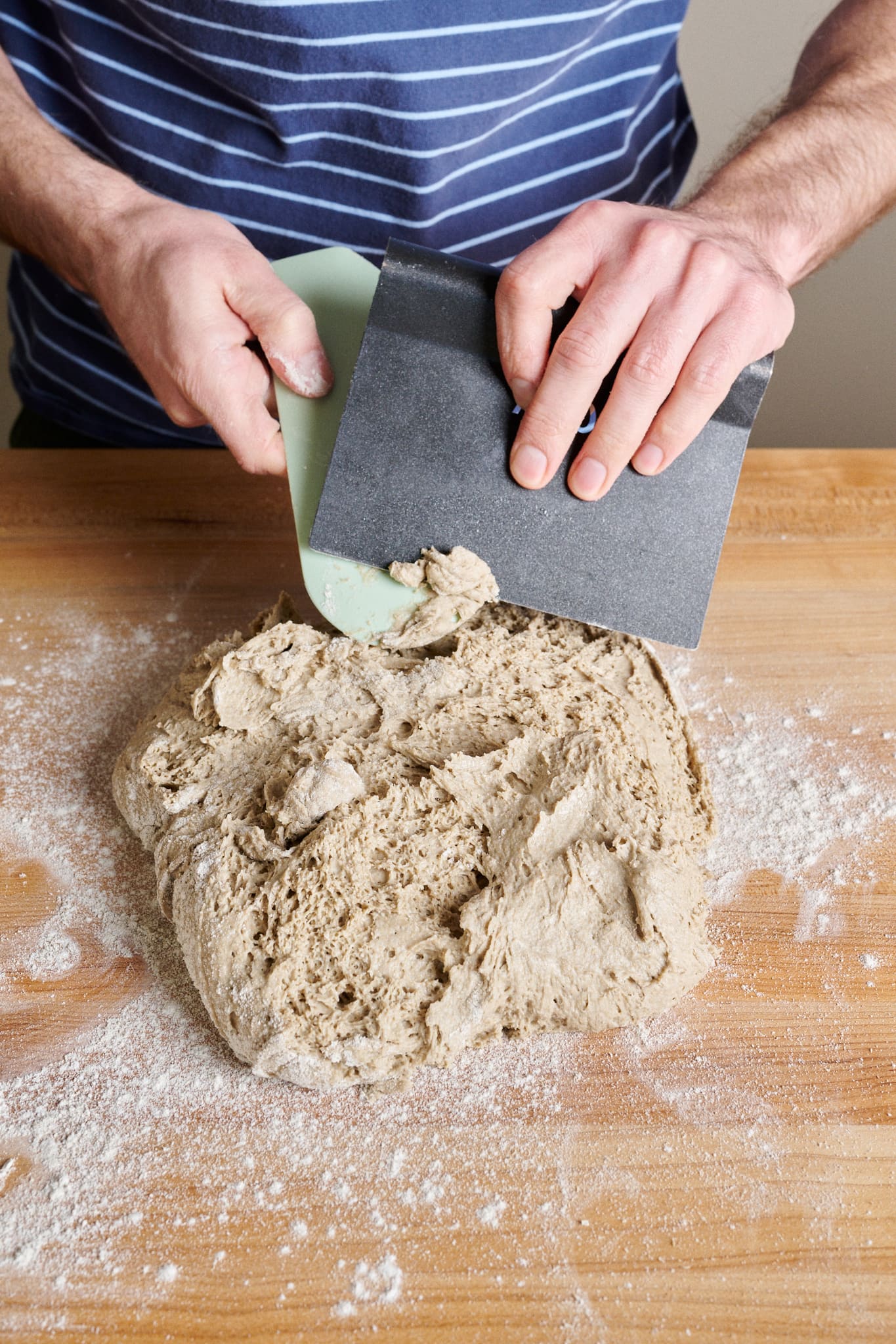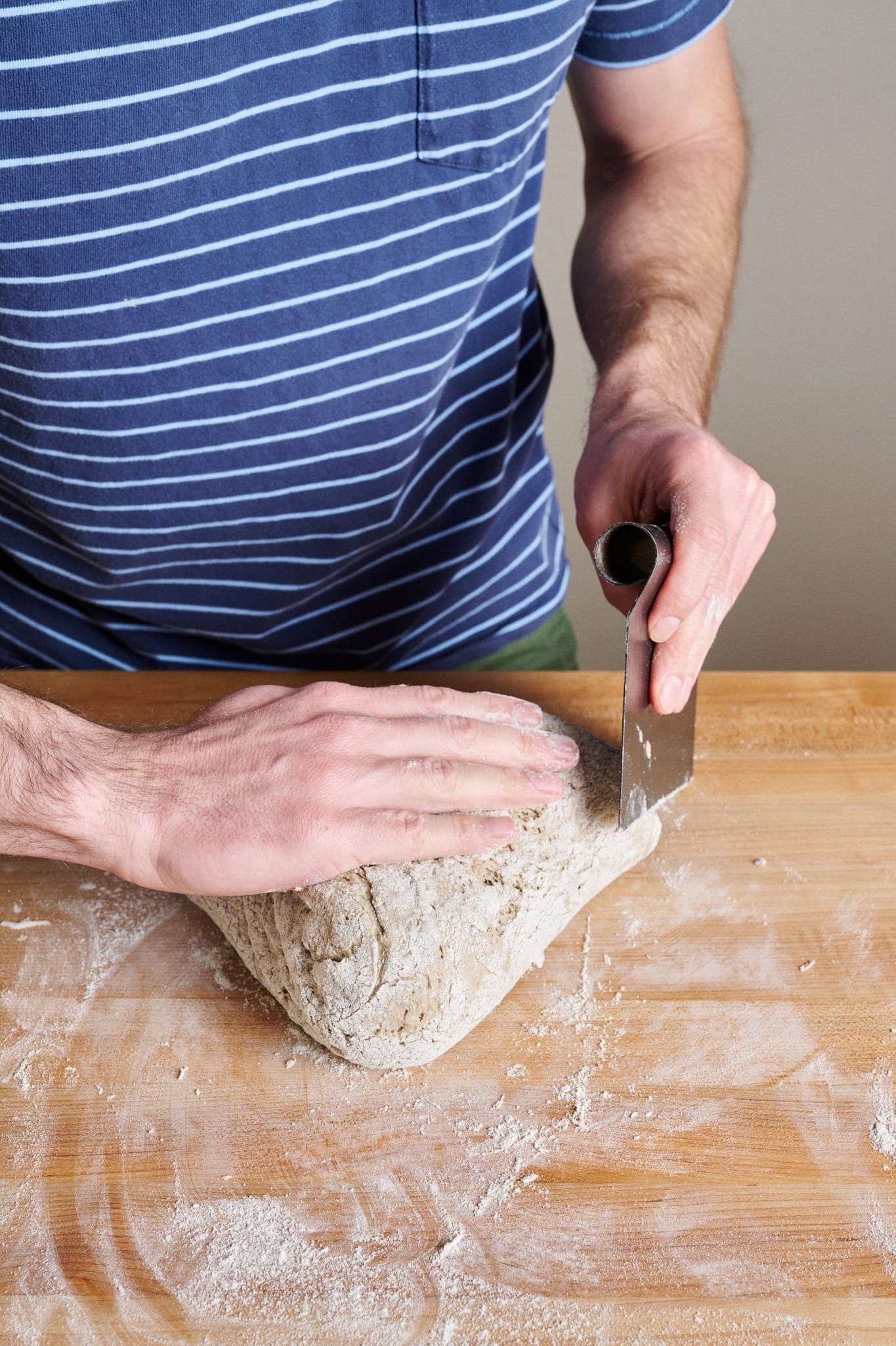 Using your bench scraper, scoop up the dough and place it seam-side-down into the prepared proofing basket.