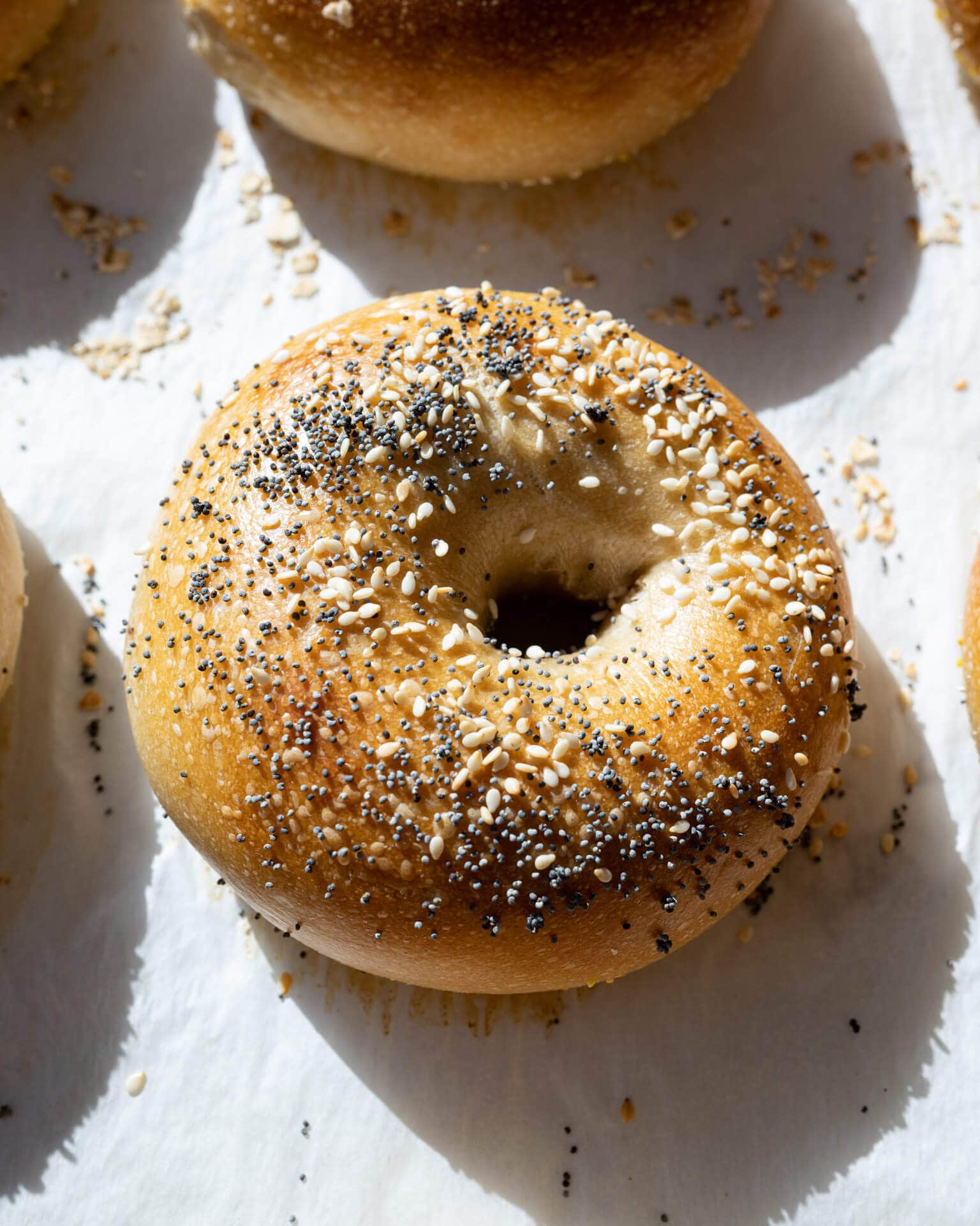 Bagels are unique because you boil the dough before baking. This boiling gelatinizes the starches in the flour and gives them a little more chew and helps them achieve a shiny crust. This gelatinization is very similar to how you make a tangzhong or roux. But for a bagel, the longer you boil them, the thicker the crust and chewier they will become. There is a limit to the boil duration, though, as they will degrade in the water after a while. I have found boiling the dough 40 seconds on each side, for a total of 1 minute and 20 seconds, to be just right.