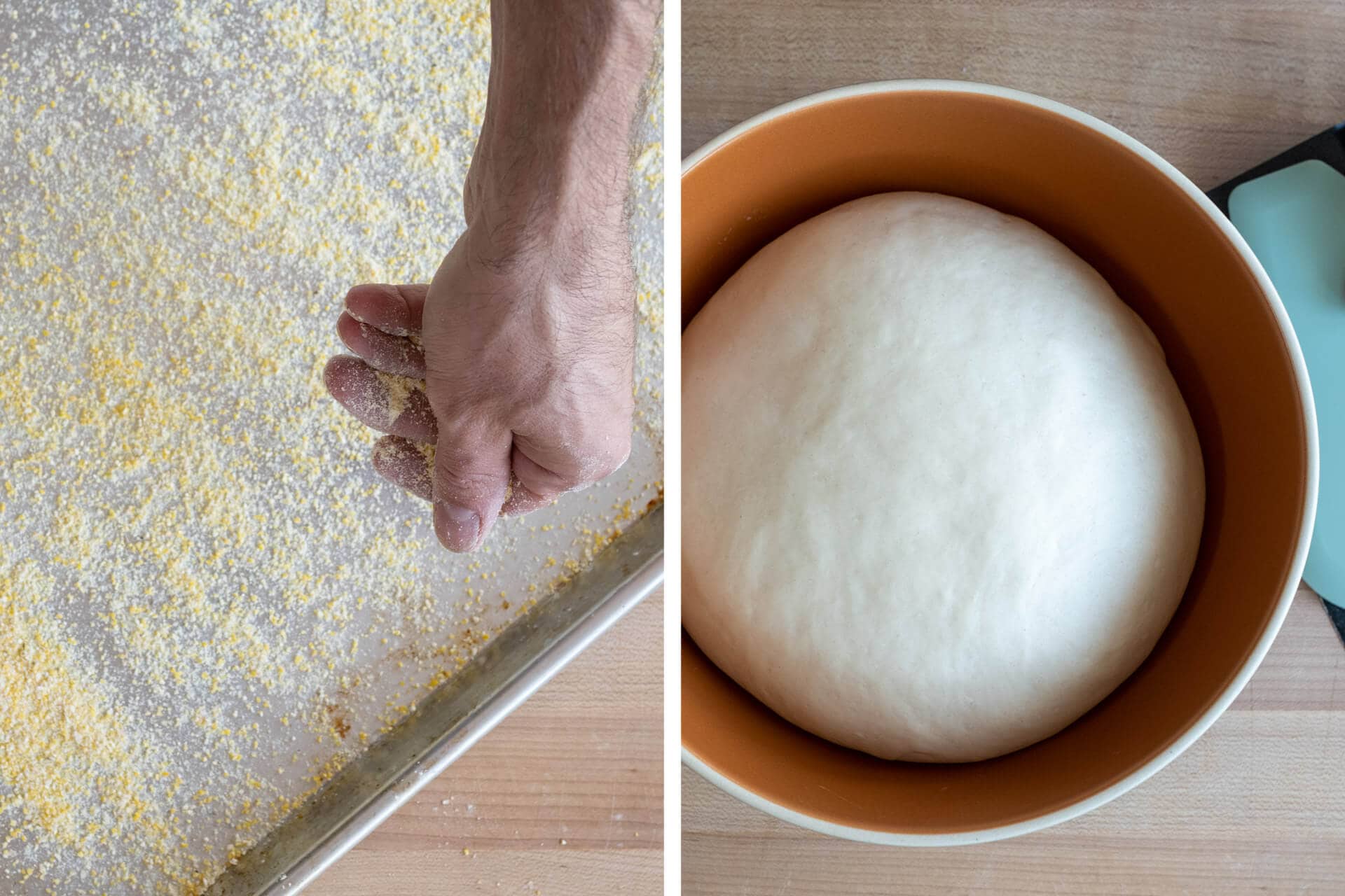Sourdough bagel dough proofing sheet with cornmeal (left); Fully bulked sourdough bagel dough ready to be divided (right).