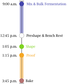 | Fold set 1 | 9:30 a.m. (15 minutes after the start of bulk fermentation) |