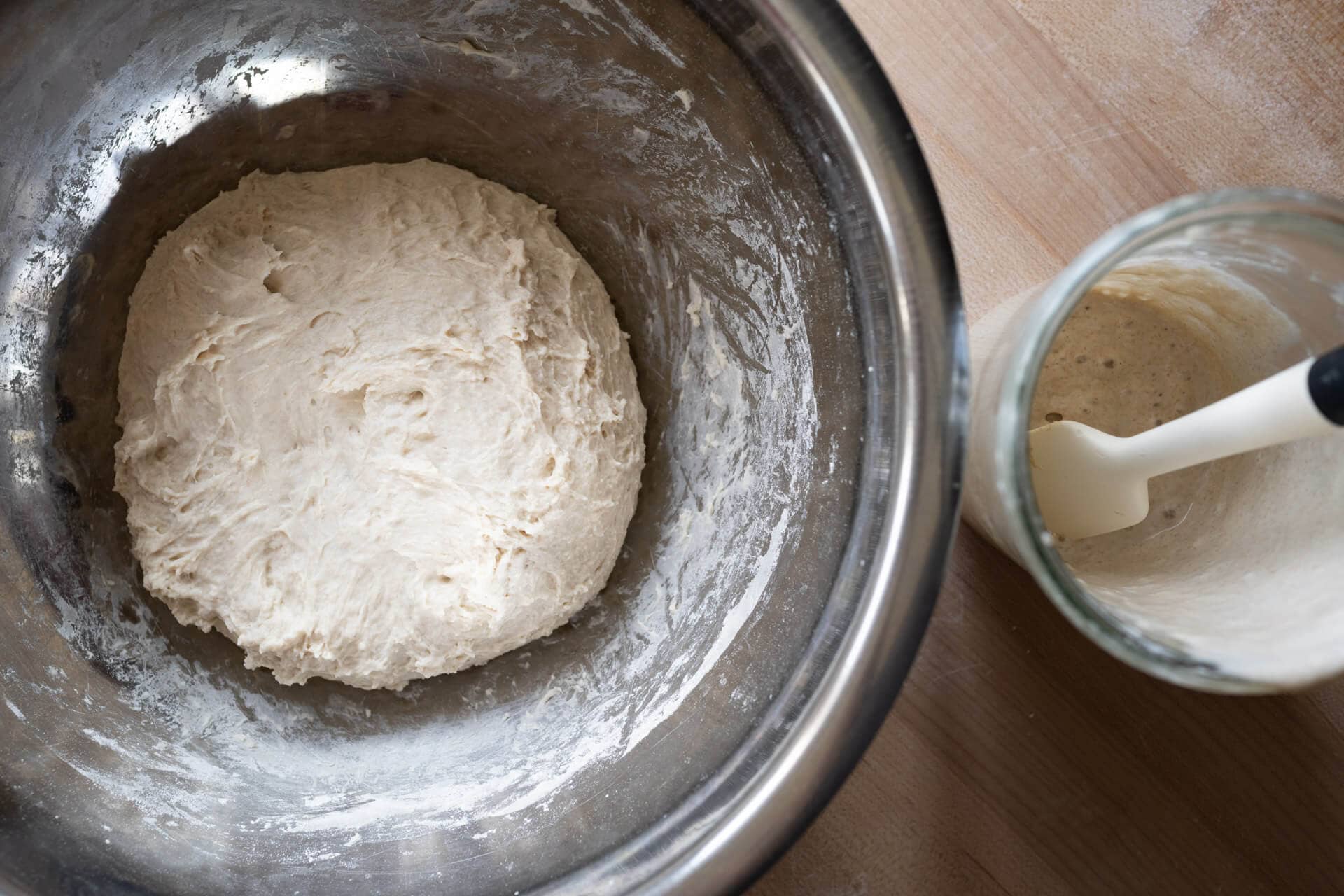 Additionally, I reduced the autolyse time for this recipe. If you’d like to give this dough a little more strength and reduce mixing time (which is already minimal!), you could autolyse the dough for 30 minutes: Mix the flour and water in the mixing bowl and let sit, covered, until your sourdough starter is ripe and ready to use.