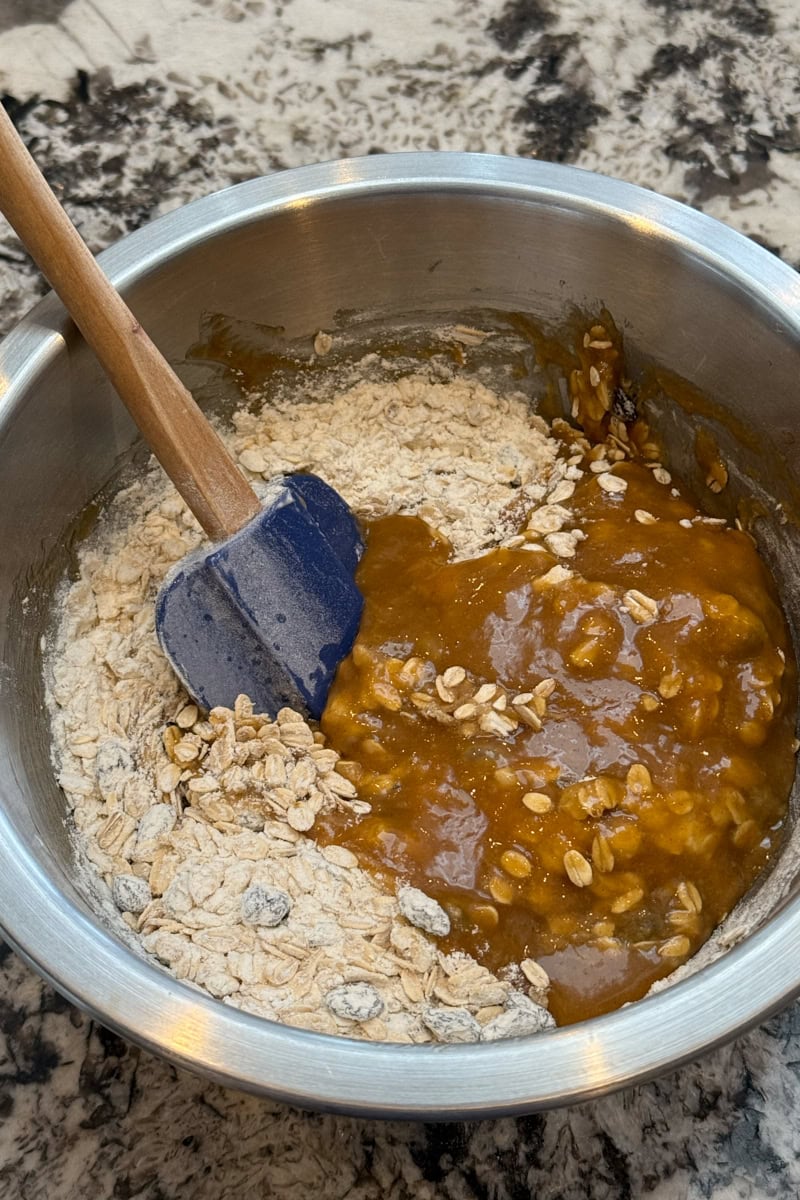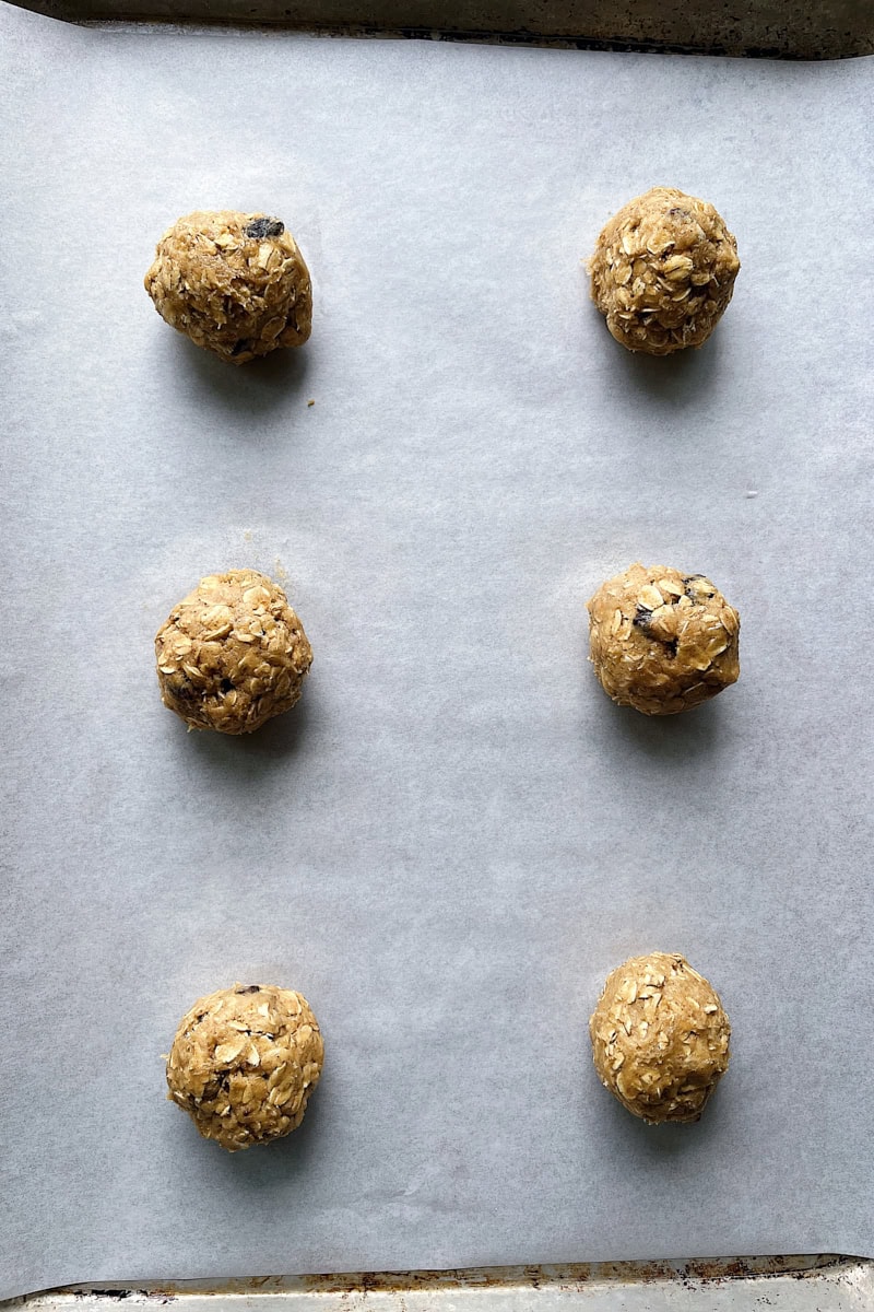 Mixing browned butter and sugar into oat and flour mixture. - Use a #24/2.6-tablespoon cookie scoop to scoop out 7 dough mounds (about 50 grams each) onto one of the prepared sheets, at least 2 inches apart (if your sheet pan is too small, do 5 or 6 at a time). Roll each mound into a ball. Bake the cookies for 9 to 11 minutes, until the edges are lightly golden and the surface of the cookies are just set.