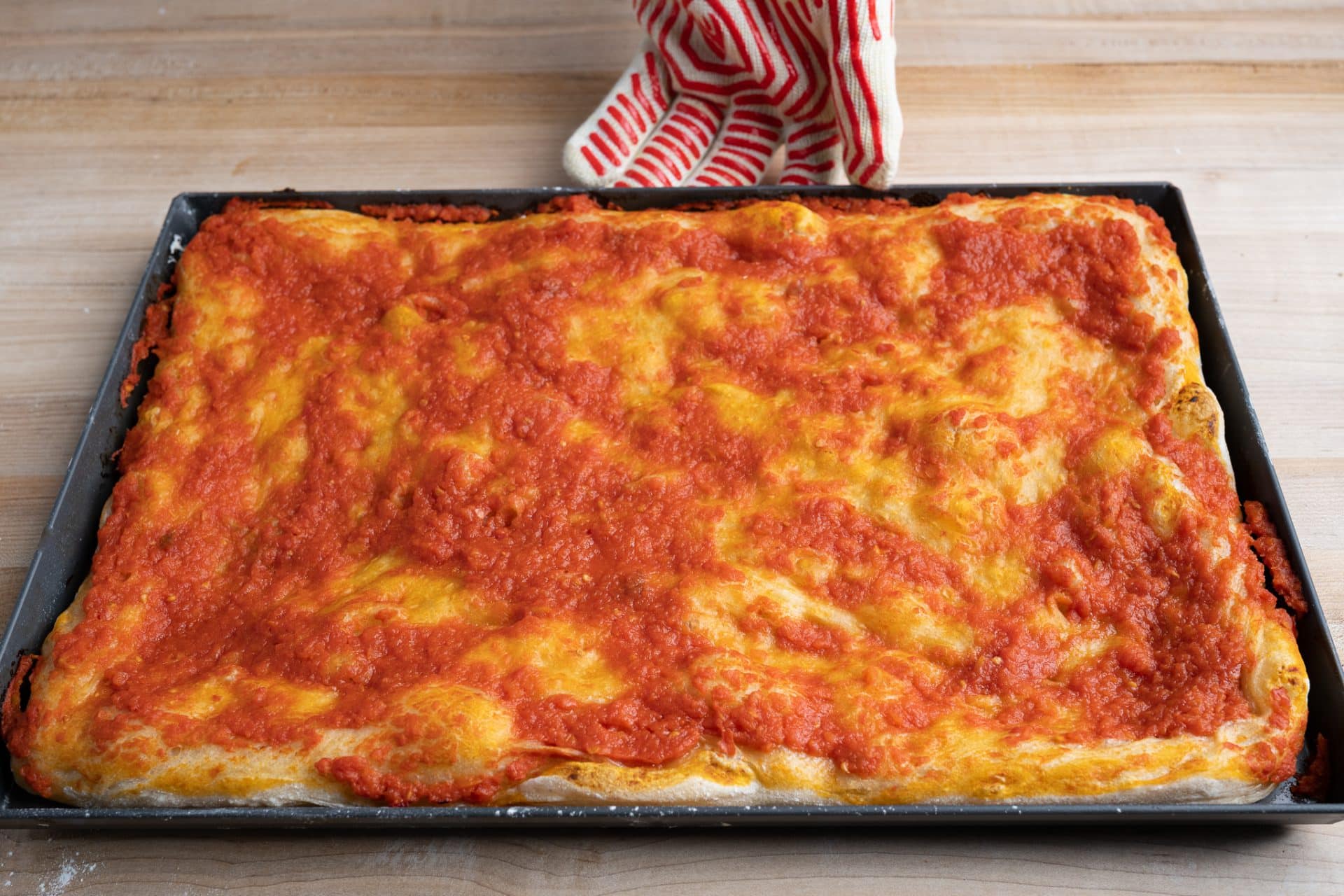 At this point, your oven with the baking surface inside should be preheated. Cooking this sourdough pizza al taglio is done in two phases: