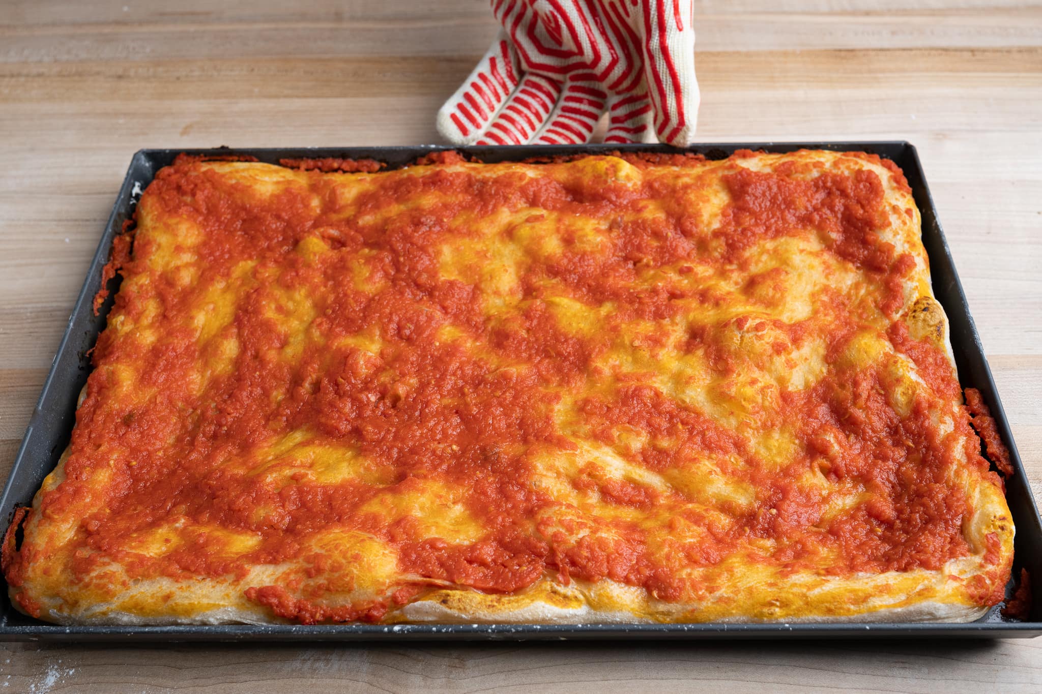 Spread pomodoro sauce over dough, edge-to, edge with no dough exposed. Slide the pan into the oven on the preheated baking steel, turn the oven down to 450°F (230°C), and bake for 10 minutes. Carefully remove the pan and place it on an oven-safe surface. Spread on cheese and any other toppings. Slide the pan back into the oven on the baking steel and cook for 10 to 15 minutes longer until the bottom is well-colored and as is the top.