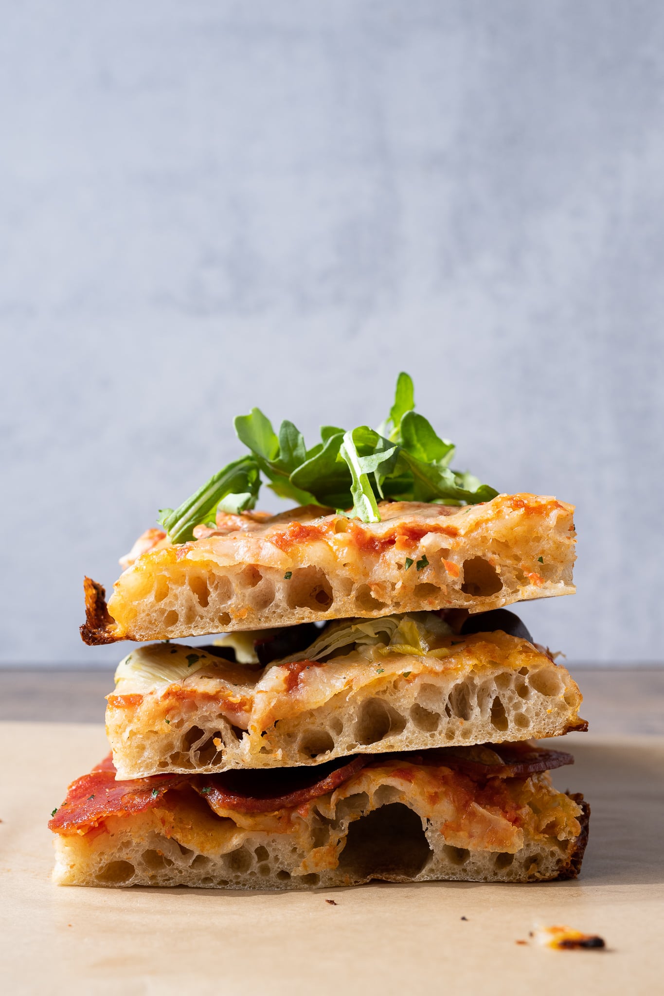 Remember, there’s a distinct difference between focaccia and this sourdough pizza al taglio, or pizza by the slice. Where focaccia spends most of its time rising directly in the pan it will be baked in, and this rectangular pizza spends its time rising in a bulk container and then is shaped out to a rectangle just before it meets the oven.