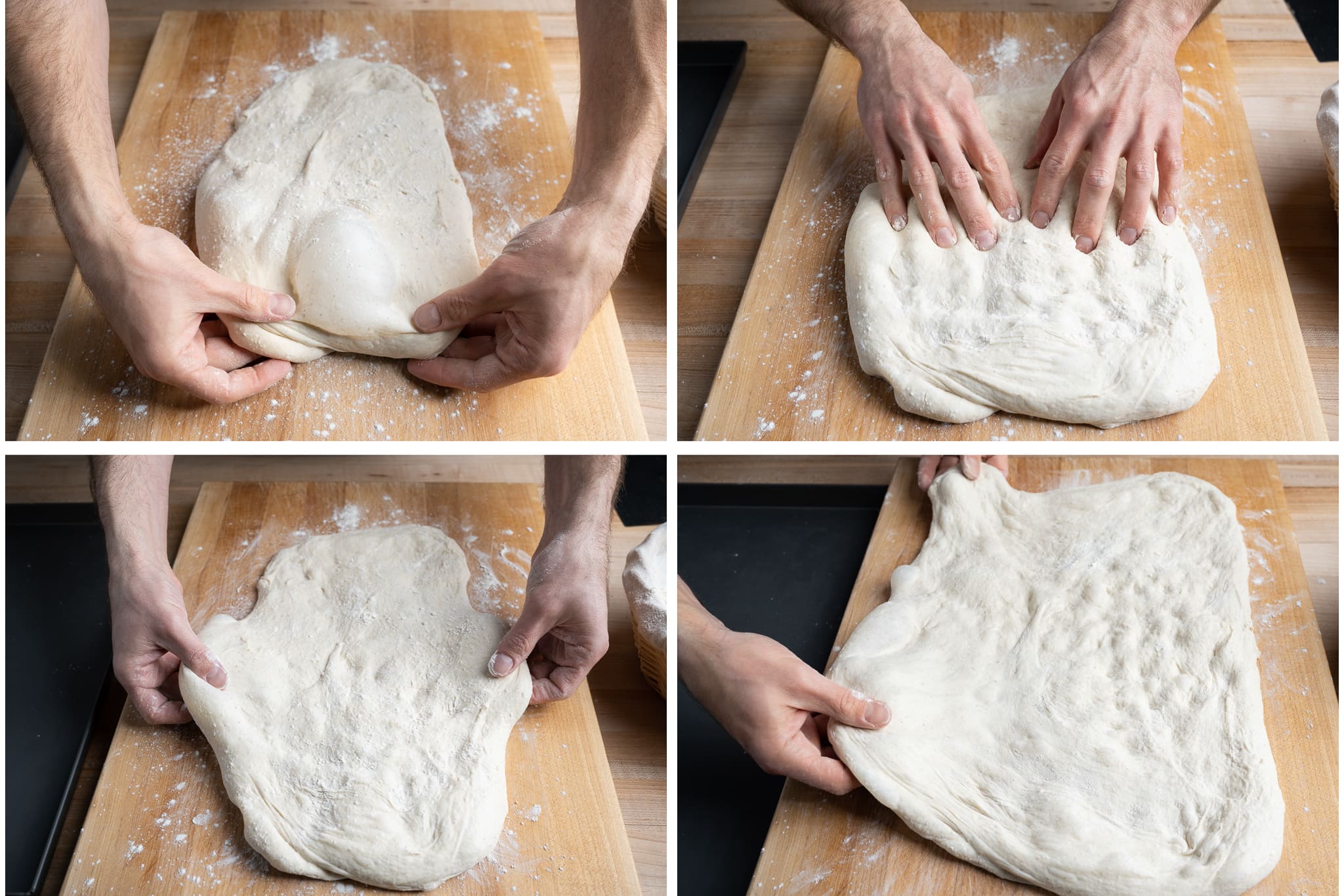 Liberally flour your work surface. Gently scrape out your dough to the floured surface and liberally flour the top. Using your fingertips, dimple the dough from top to bottom. Then, gently grab the sides and spread the dough outward. Repeat this, spreading at the dough’s top and bottom, coercing the mass into a large rectangle shape. The rectangle does not need to be as large as your sheet pan; you can finish stretching once you transfer the dough over.